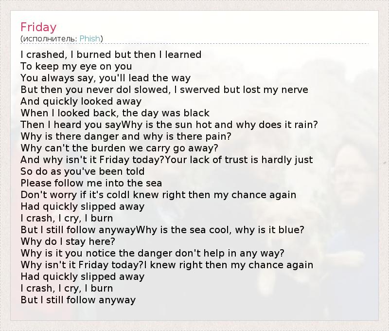 I crashed, I burned but then I learned To keep my eye on you You always say, you'll lead the way But then you never doI slowed, I swerved but lost my nerve And quickly looked away When I looked back, the day was black Then I heard you sayWhy is the sun hot and why does it rain? Why is there danger and why is there pain? Why can't the burden we carry go away? And why isn't it Friday today?Your lack of trust is hardly just So do as you've been told Please follow me into the sea Don't worry if it's coldI knew right then my chance again Had quickly slipped away I crash, I cry, I burn But I still follow anywayWhy is the sea cool, why is it blue? Why do I stay here? Why is it you notice the danger don't help in any way? Why isn't it Friday today?I knew right then my chance again Had quickly slipped away I crash, I cry, I burn But I still follow anyway