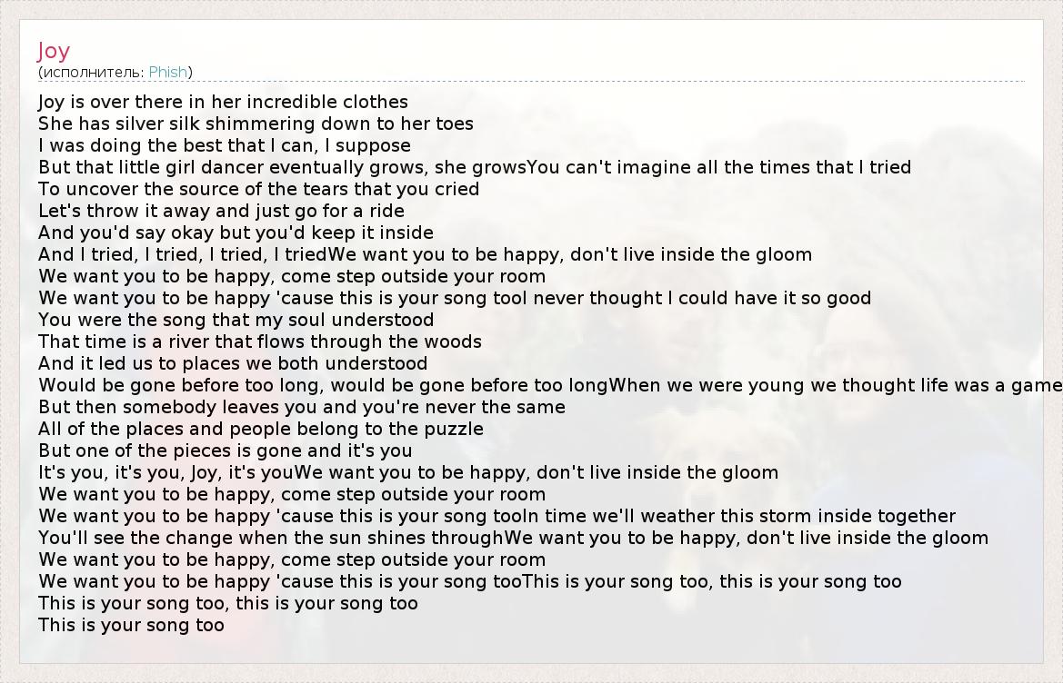 It's you, it's you, Joy, it's youWe want you to be happy, don't live inside the gloom