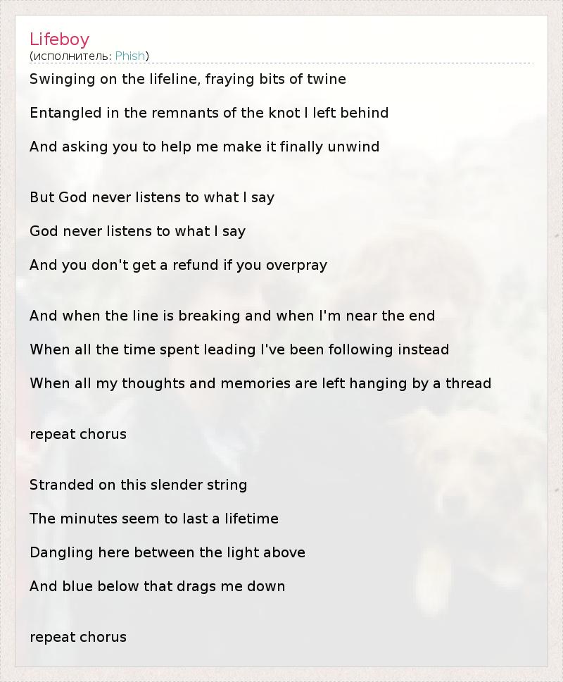 Swinging on the lifeline, fraying bits of twine Entangled in the remnants of the knot I left behind And asking you to help me make it finally unwind But God never listens to what I say God never listens to what I say And you don't get a refund if you overpray And when the line is breaking and when I'm near the end When all the time spent leading I've been following instead When all my thoughts and memories are left hanging by a thread repeat chorus Stranded on this slender string The minutes seem to last a lifetime Dangling here between the light above And blue below that drags me down repeat chorus