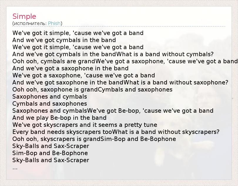 Это интересно:Phish — американская рок-группа, примечательная своими джем-сейшнами, импровизациями и постмодернистским смешением жанров. Phish была образована в 1983 году в университете Вермонта. Четыре ее участника выступали вместе 21 год, пока не распались в августе 2004 года. Их музыка содержала в себе элементы широкoго спектра жанров, и каждый их концерт был оригинальным в плане исполнения песен, порядка... продолжение
