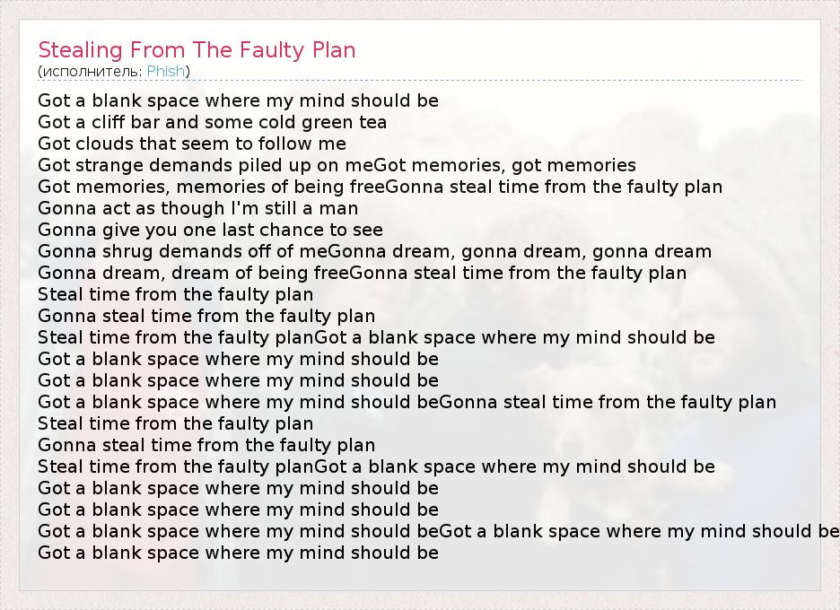 Got a blank space where my mind should beGonna steal time from the faulty plan