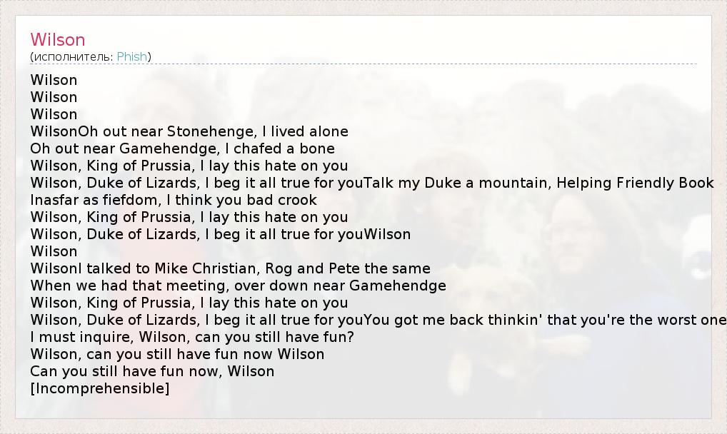 Это интересно:Phish — американская рок-группа, примечательная своими джем-сейшнами, импровизациями и постмодернистским смешением жанров. Phish была образована в 1983 году в университете Вермонта. Четыре ее участника выступали вместе 21 год, пока не распались в августе 2004 года. Их музыка содержала в себе элементы широкoго спектра жанров, и каждый их концерт был оригинальным в плане исполнения песен, порядка... продолжение