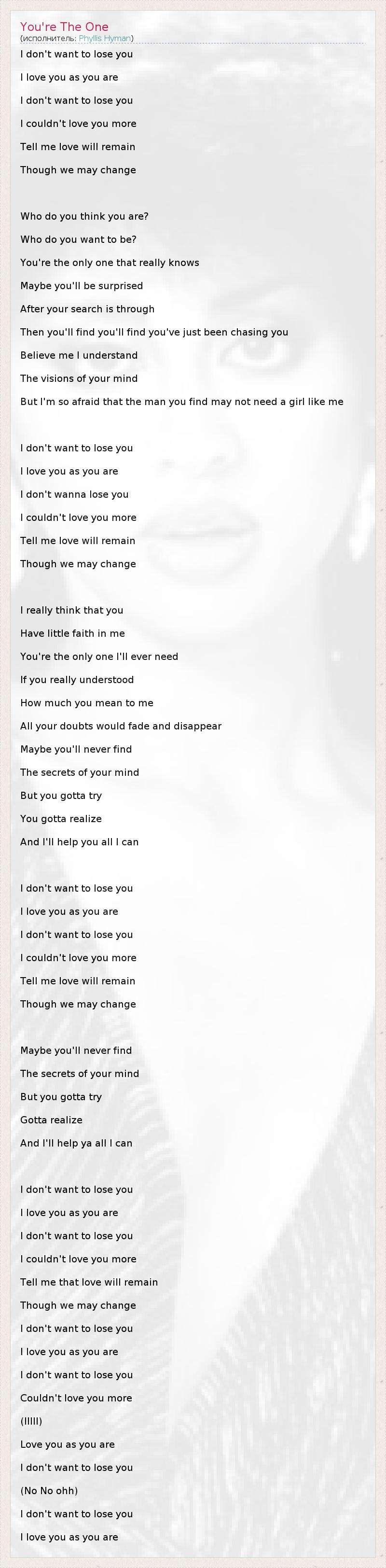 I don't want to lose you I love you as you are I don't want to lose you I couldn't love you more Tell me love will remain Though we may change Who do you think you are? Who do you want to be? You're the only one that really knows Maybe you'll be surprised After your search is through Then you'll find you'll find you've just been chasing you Believe me I understand The visions of your mind But I'm so afraid that the man you find may not need a girl like me I don't want to lose you I love you as you are I don't wanna lose you I couldn't love you more Tell me love will remain Though we may change I really think that you Have little faith in me You're the only one I'll ever need If you really understood How much you mean to me All your doubts would fade and disappear Maybe you'll never find The secrets of your mind But you gotta try You gotta realize And I'll help you all I can I don't want to lose you I love you as you are I don't want to lose you I couldn't love you more Tell me love will remain Though we may change Maybe you'll never find The secrets of your mind But you gotta try Gotta realize And I'll help ya all I can I don't want to lose you I love you as you are I don't want to lose you I couldn't love you more Tell me that love will remain Though we may change I don't want to lose you I love you as you are I don't want to lose you Couldn't love you more (IIIII) Love you as you are I don't want to lose you (No No ohh) I don't want to lose you I love you as you are