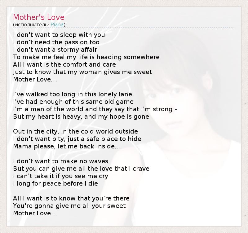 Я не хочу с тобою спать, И страсть мне тоже не нужна. Мне не нужен бурный роман, Чтобы почувствовать, что моя жизнь имеет смысл. Все, что мне нужно, - это поддержка и забота, Мне просто нужно, чтобы моя жена дарила мне нежную Материнскую любовь… Я слишком долго брел в одиночестве по этой дороге, Мне надоела эта однообразная старая игра. Я – человек, и говорят, что я сильный, Но у меня тяжело на сердце, и я потерял надежду. На улицах города, в холодном внешнем мире Мне не нужна жалость – только надежное убежище. Мама, пожалуйста, позволь мне вернуться… Я не хочу разгонять волны, Но ты можешь подарить мне любовь, которая мне так нужна… Я не смогу ее принять, если ты увидишь, что я плачу. Я ищу покоя перед смертью, Я хочу знать только одно – что ты рядом И что ты подаришь мне всю свою нежную Материнскую любовь…