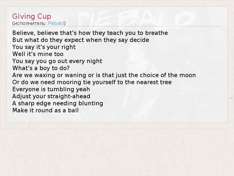 А как ты думаешь, о чем песня "Giving Cup" ?