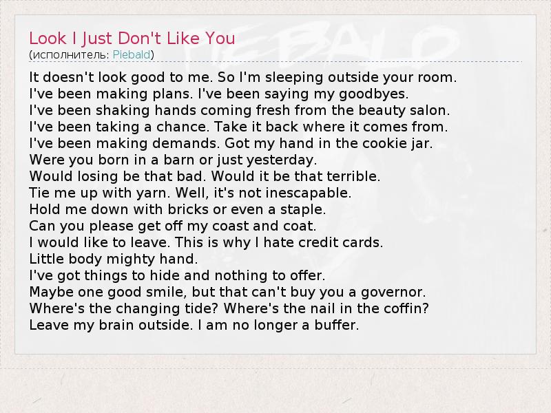 А как ты думаешь, о чем песня "Look I Just Don't Like You" ?
