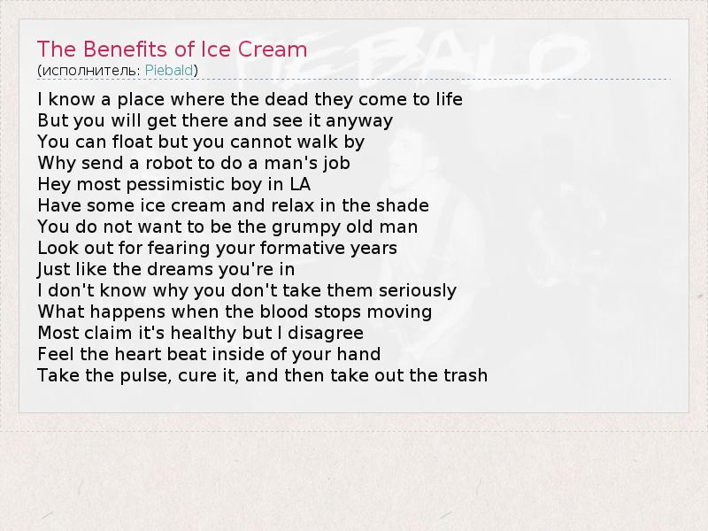 А как ты думаешь, о чем песня "The Benefits of Ice Cream" ?
