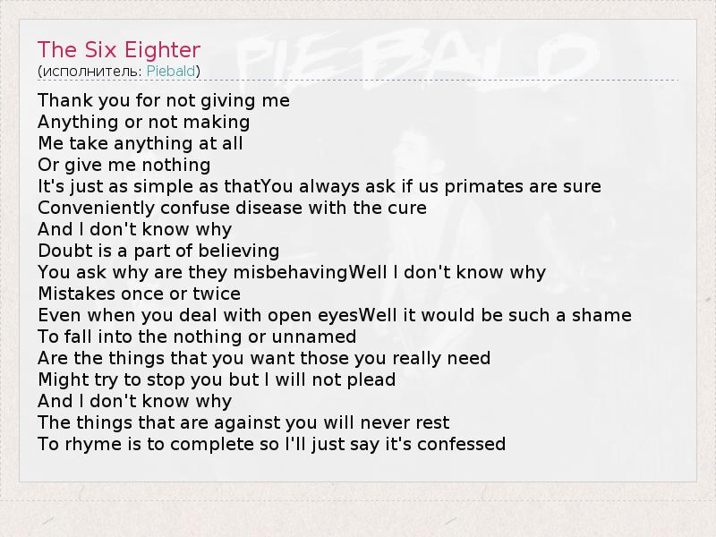 Thank you for not giving me Anything or not making Me take anything at all Or give me nothing It's just as simple as thatYou always ask if us primates are sure Conveniently confuse disease with the cure And I don't know why Doubt is a part of believing You ask why are they misbehavingWell I don't know why Mistakes once or twice Even when you deal with open eyesWell it would be such a shame To fall into the nothing or unnamed Are the things that you want those you really need Might try to stop you but I will not plead And I don't know why The things that are against you will never rest To rhyme is to complete so I'll just say it's confessed