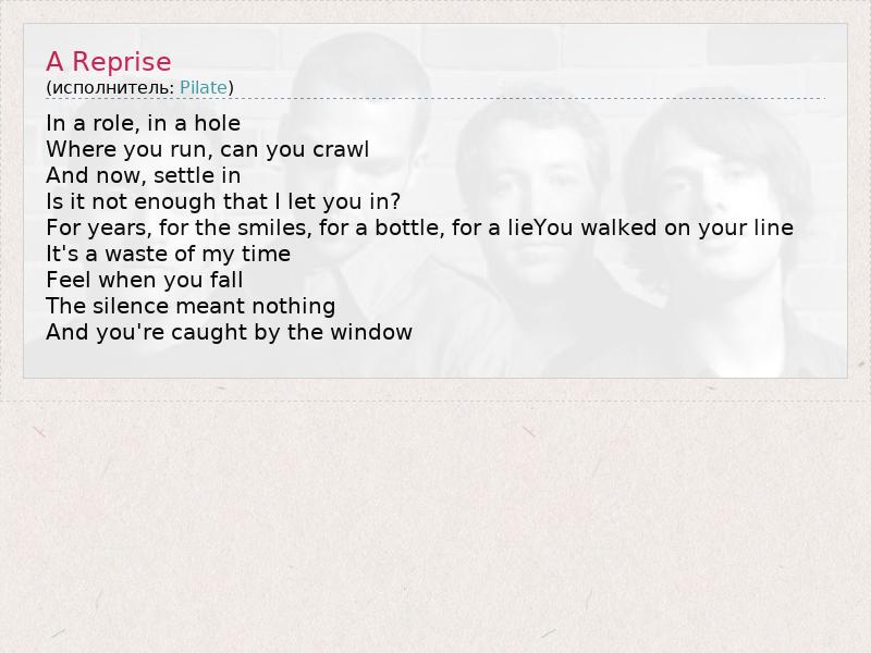 Это интересно:Канадская инди-рок группа,в состав которой входят 4 участника:Todd Clark - вокал,пианиноChris Greenough - гитараRuby Bumrah - бассBill Keeley - ударныеГруппа была основана в 1999 году в Торонто.В 2001-ом выпустили свой дебютный ЕР «For All That’s Given, Wasted»,после чего был подписан контракт с лейблом MapleMusic Recordings.Изначально группа называлась Pilate,под этим именем они выпустили 2 альбома-Caught by the Window в 2003-ем и... продолжение