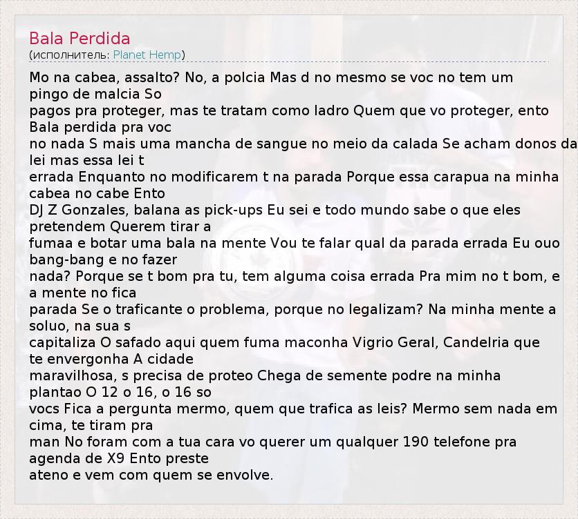 Mo na cabea, assalto? No, a polcia Mas d no mesmo se voc no tem um pingo de malcia So pagos pra proteger, mas te tratam como ladro Quem que vo proteger, ento Bala perdida pra voc no nada S mais uma mancha de sangue no meio da calada Se acham donos da lei mas essa lei t errada Enquanto no modificarem t na parada Porque essa carapua na minha cabea no cabe Ento DJ Z Gonzales, balana as pick-ups Eu sei e todo mundo sabe o que eles pretendem Querem tirar a fumaa e botar uma bala na mente Vou te falar qual da parada errada Eu ouo bang-bang e no fazer nada? Porque se t bom pra tu, tem alguma coisa errada Pra mim no t bom, e a mente no fica parada Se o traficante o problema, porque no legalizam? Na minha mente a soluo, na sua s capitaliza O safado aqui quem fuma maconha Vigrio Geral, Candelria que te envergonha A cidade maravilhosa, s precisa de proteo Chega de semente podre na minha plantao O 12 o 16, o 16 so vocs Fica a pergunta mermo, quem que trafica as leis? Mermo sem nada em cima, te tiram pra man No foram com a tua cara vo querer um qualquer 190 telefone pra agenda de X9 Ento preste ateno e vem com quem se envolve.