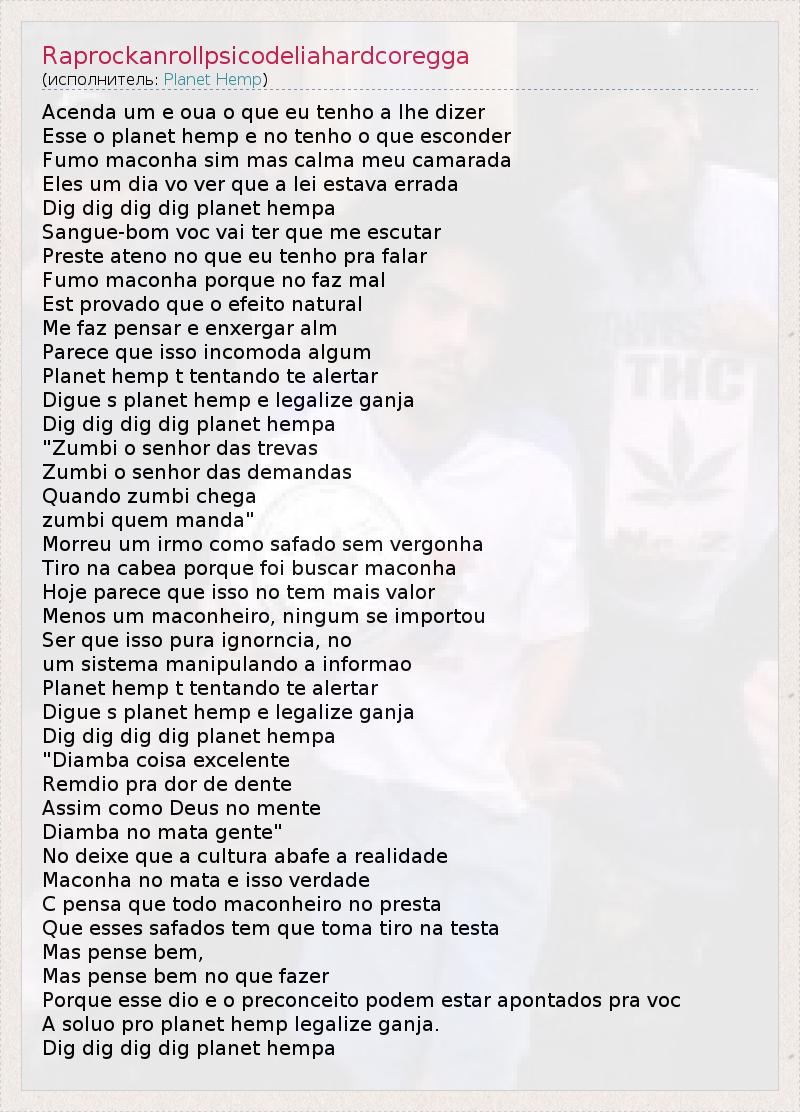 Это интересно:Planet Hemp was a Brazilian hip hop/rapcore musical group, known for starting the career of rapper Marcelo D2 and for its lyrics supporting the legality of cannabis. The band was founded in Rio de Janeiro in 1993, with original members Marcelo D2, Skunk, Rafael, Formigão and Bacalhau.The band broke up in 2001 due to differences between the band members, and Marcelo D2's increasing focus on his solo projects.