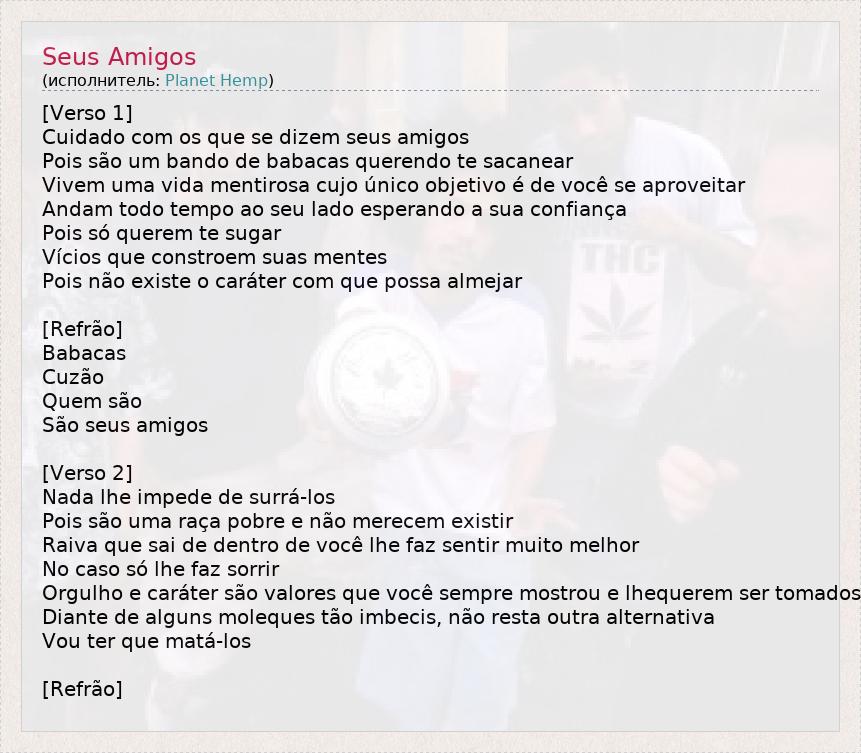 Это интересно:Planet Hemp was a Brazilian hip hop/rapcore musical group, known for starting the career of rapper Marcelo D2 and for its lyrics supporting the legality of cannabis. The band was founded in Rio de Janeiro in 1993, with original members Marcelo D2, Skunk, Rafael, Formigão and Bacalhau.The band broke up in 2001 due to differences between the band members, and Marcelo D2's increasing focus on his solo projects.
