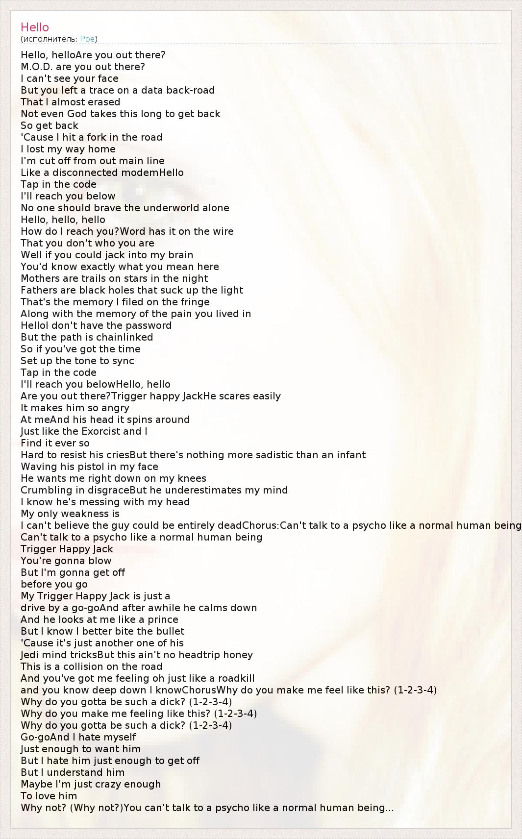 Это интересно:Named for a halloween costume based on an Edgar Allan Poe short story, Poe gained a contract with Atlantic during the boom of female singer/songwriters during the mid-'90s. Originally from New York City, she moved around frequently with her parents — a director and an actress — but returned to New York at the age of 16 when they divorced. Poe enrolled at Princeton, and played in a band during her time there. Signed to Atlantic in 1994, she recorded an album with several producers and co-writers and released Hello the following year. The single "Angry Johnny" pushed Hello into the album charts, and during 1996 Poe supported Lenny Kravitz with a band including guitarist... продолжение