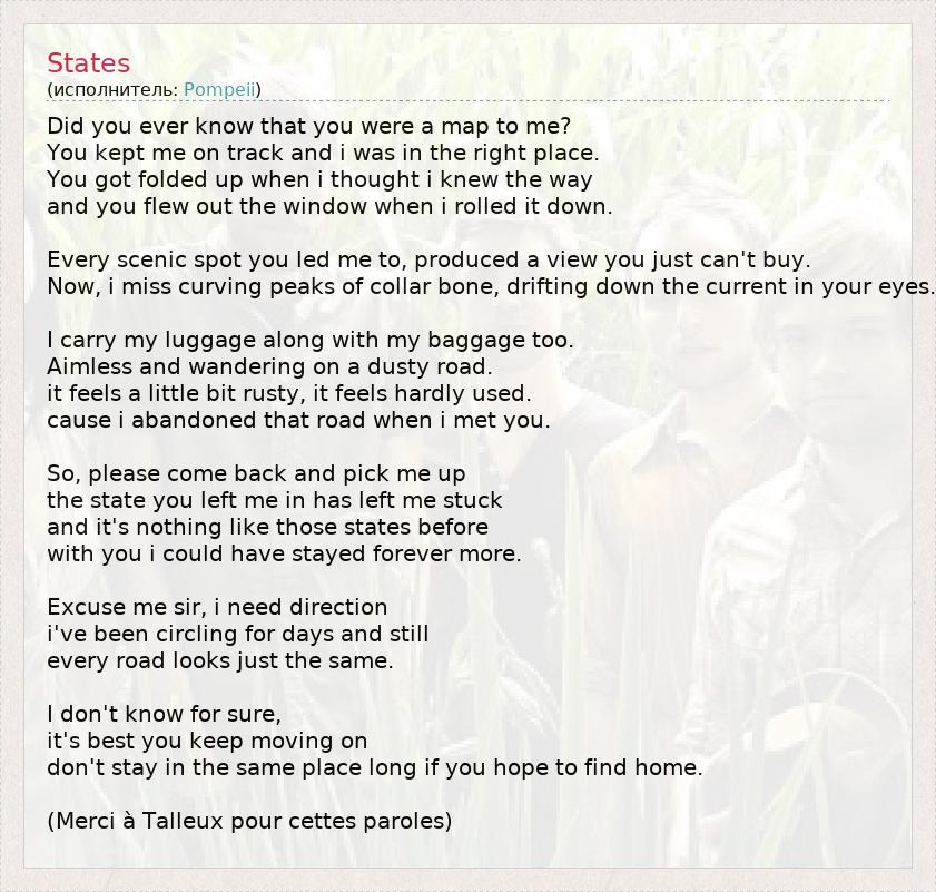 Did you ever know that you were a map to me? You kept me on track and i was in the right place. You got folded up when i thought i knew the way and you flew out the window when i rolled it down. Every scenic spot you led me to, produced a view you just can't buy. Now, i miss curving peaks of collar bone, drifting down the current in your eyes. I carry my luggage along with my baggage too. Aimless and wandering on a dusty road. it feels a little bit rusty, it feels hardly used. cause i abandoned that road when i met you. So, please come back and pick me up the state you left me in has left me stuck and it's nothing like those states before with you i could have stayed forever more. Excuse me sir, i need direction i've been circling for days and still every road looks just the same. I don't know for sure, it's best you keep moving on don't stay in the same place long if you hope to find home. (Merci à Talleux pour cettes paroles)