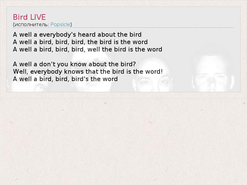 A well a everybody's heard about the bird A well a bird, bird, bird, the bird is the word A well a bird, bird, bird, well the bird is the word A well a don't you know about the bird? Well, everybody knows that the bird is the word! A well a bird, bird, bird's the word