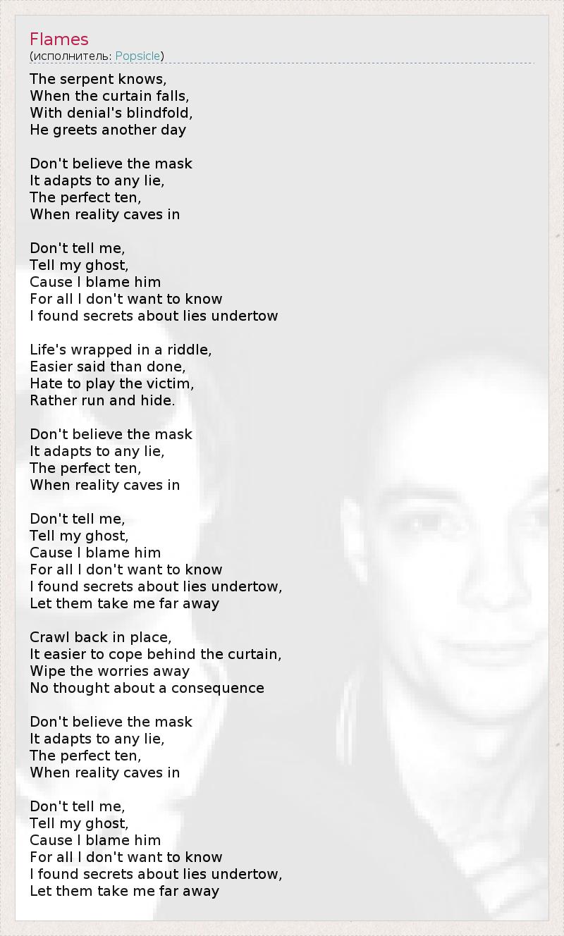Дьяволу известно, Когда спадёт пелена. Отрешённым взглядом завязанных глаз Он приветствует новый день. Не доверяй маске, Она искажается с каждым новым обманом. Становится идеалом, Когда реальность отступает… Не говори мне, Говори моему призраку, Потому что я виню его Во всём, чего я не хотел бы знать. Я нахожу тайны об обмане в глубине… Жизнь опутана проблемами, О которых проще говорить, чем решать. Я ненавижу играть жертву, Скорее убежал и спрятался бы. Не доверяй маске, Она искажается с каждым новым обманом. Становится идеалом, Когда реальность отступает… Не говори мне, Говори моему призраку, Потому что я виню его Во всём, чего я не хотел бы знать. Я нахожу тайны об обмане в глубине, Пусть они заберут меня подальше… Отползаю на своё место, За занавесом бороться легче. Стираю все опасения, Ни единой мысли о последствиях. Не доверяй маске, Она искажается с каждым новым обманом, Становится идеальной, Когда реальность отступает… Не говори мне, Говори моему призраку, Потому что я виню его Во всём, чего я не хотел бы знать. Я нахожу тайны об обмане в глубине, Пусть они заберут меня подальше…