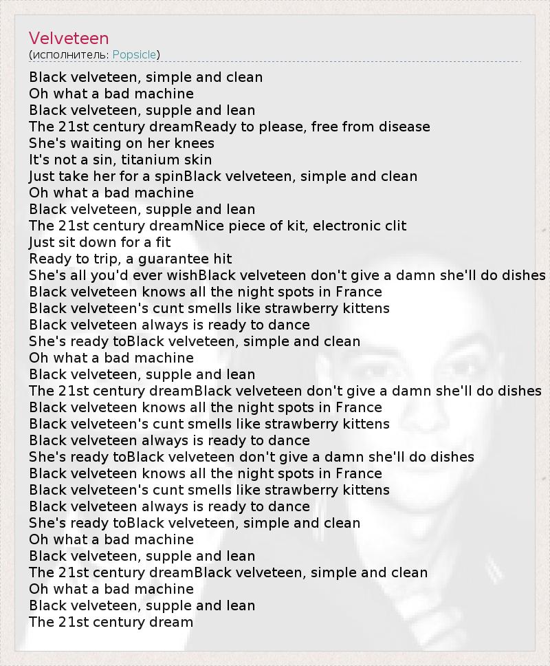 Black velveteen, simple and clean Oh what a bad machine Black velveteen, supple and lean The 21st century dreamReady to please, free from disease She's waiting on her knees It's not a sin, titanium skin Just take her for a spinBlack velveteen, simple and clean Oh what a bad machine Black velveteen, supple and lean The 21st century dreamNice piece of kit, electronic clit Just sit down for a fit Ready to trip, a guarantee hit She's all you'd ever wishBlack velveteen don't give a damn she'll do dishes Black velveteen knows all the night spots in France Black velveteen's cunt smells like strawberry kittens Black velveteen always is ready to dance She's ready toBlack velveteen, simple and clean Oh what a bad machine Black velveteen, supple and lean The 21st century dreamBlack velveteen don't give a damn she'll do dishes Black velveteen knows all the night spots in France Black velveteen's cunt smells like strawberry kittens Black velveteen always is ready to dance She's ready toBlack velveteen don't give a damn she'll do dishes Black velveteen knows all the night spots in France Black velveteen's cunt smells like strawberry kittens Black velveteen always is ready to dance She's ready toBlack velveteen, simple and clean Oh what a bad machine Black velveteen, supple and lean The 21st century dreamBlack velveteen, simple and clean Oh what a bad machine Black velveteen, supple and lean The 21st century dream