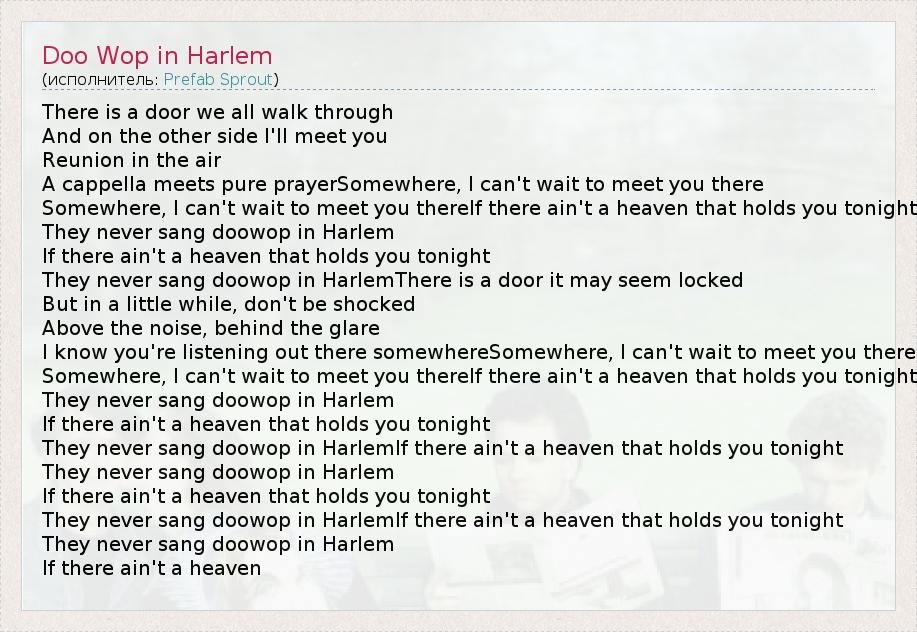 There is a door we all walk through And on the other side I'll meet you Reunion in the air A cappella meets pure prayerSomewhere, I can't wait to meet you there Somewhere, I can't wait to meet you thereIf there ain't a heaven that holds you tonight They never sang doowop in Harlem If there ain't a heaven that holds you tonight They never sang doowop in HarlemThere is a door it may seem locked But in a little while, don't be shocked Above the noise, behind the glare I know you're listening out there somewhereSomewhere, I can't wait to meet you there Somewhere, I can't wait to meet you thereIf there ain't a heaven that holds you tonight They never sang doowop in Harlem If there ain't a heaven that holds you tonight They never sang doowop in HarlemIf there ain't a heaven that holds you tonight They never sang doowop in Harlem If there ain't a heaven that holds you tonight They never sang doowop in HarlemIf there ain't a heaven that holds you tonight They never sang doowop in Harlem If there ain't a heaven