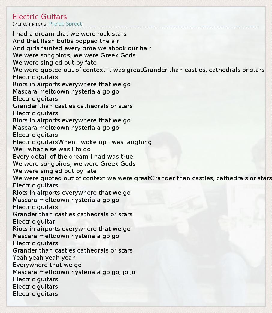 I had a dream that we were rock stars And that flash bulbs popped the air And girls fainted every time we shook our hair We were songbirds, we were Greek Gods We were singled out by fate We were quoted out of context it was greatGrander than castles, cathedrals or stars Electric guitars Riots in airports everywhere that we go Mascara meltdown hysteria a go go Electric guitars Grander than castles cathedrals or stars Electric guitars Riots in airports everywhere that we go Mascara meltdown hysteria a go go Electric guitars Electric guitarsWhen I woke up I was laughing Well what else was I to do Every detail of the dream I had was true We were songbirds, we were Greek Gods We were singled out by fate We were quoted out of context we were greatGrander than castles, cathedrals or stars Electric guitars Riots in airports everywhere that we go Mascara meltdown hysteria a go go Electric guitars Grander than castles cathedrals or stars Electric guitar Riots in airports everywhere that we go Mascara meltdown hysteria a go go Electric guitars Grander than castles cathedrals or stars Yeah yeah yeah yeah Everywhere that we go Mascara meltdown hysteria a go go, jo jo Electric guitars Electric guitars Electric guitars