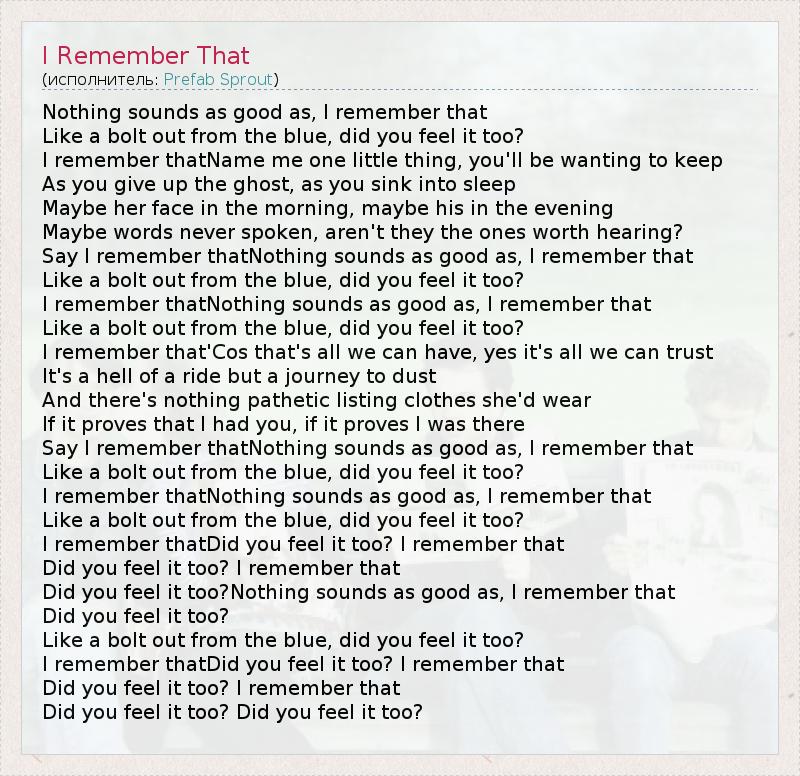 Nothing sounds as good as, I remember that Like a bolt out from the blue, did you feel it too? I remember thatName me one little thing, you'll be wanting to keep As you give up the ghost, as you sink into sleep Maybe her face in the morning, maybe his in the evening Maybe words never spoken, aren't they the ones worth hearing? Say I remember thatNothing sounds as good as, I remember that Like a bolt out from the blue, did you feel it too? I remember thatNothing sounds as good as, I remember that Like a bolt out from the blue, did you feel it too? I remember that'Cos that's all we can have, yes it's all we can trust It's a hell of a ride but a journey to dust And there's nothing pathetic listing clothes she'd wear If it proves that I had you, if it proves I was there Say I remember thatNothing sounds as good as, I remember that Like a bolt out from the blue, did you feel it too? I remember thatNothing sounds as good as, I remember that Like a bolt out from the blue, did you feel it too? I remember thatDid you feel it too? I remember that Did you feel it too? I remember that Did you feel it too?Nothing sounds as good as, I remember that Did you feel it too? Like a bolt out from the blue, did you feel it too? I remember thatDid you feel it too? I remember that Did you feel it too? I remember that Did you feel it too? Did you feel it too?