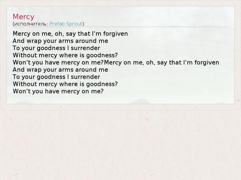 Won't you have mercy on me?Mercy on me, oh, say that I'm forgiven