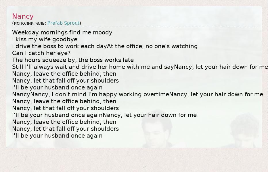 Weekday mornings find me moody I kiss my wife goodbye I drive the boss to work each dayAt the office, no one's watching Can I catch her eye? The hours squeeze by, the boss works late Still I'll always wait and drive her home with me and sayNancy, let your hair down for me Nancy, leave the office behind, then Nancy, let that fall off your shoulders I'll be your husband once again NancyNancy, I don't mind I'm happy working overtimeNancy, let your hair down for me Nancy, leave the office behind, then Nancy, let that fall off your shoulders I'll be your husband once againNancy, let your hair down for me Nancy, leave the office behind, then Nancy, let that fall off your shoulders I'll be your husband once again
