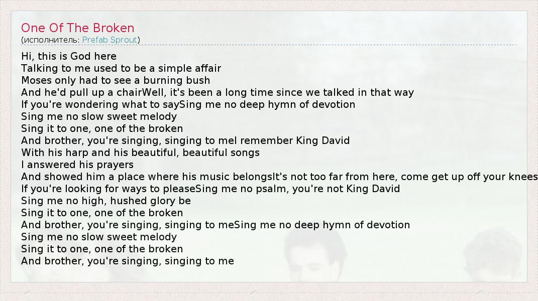 Hi, this is God here Talking to me used to be a simple affair Moses only had to see a burning bush And he'd pull up a chairWell, it's been a long time since we talked in that way If you're wondering what to saySing me no deep hymn of devotion Sing me no slow sweet melody Sing it to one, one of the broken And brother, you're singing, singing to meI remember King David With his harp and his beautiful, beautiful songs I answered his prayers And showed him a place where his music belongsIt's not too far from here, come get up off your knees If you're looking for ways to pleaseSing me no psalm, you're not King David Sing me no high, hushed glory be Sing it to one, one of the broken And brother, you're singing, singing to meSing me no deep hymn of devotion Sing me no slow sweet melody Sing it to one, one of the broken And brother, you're singing, singing to me