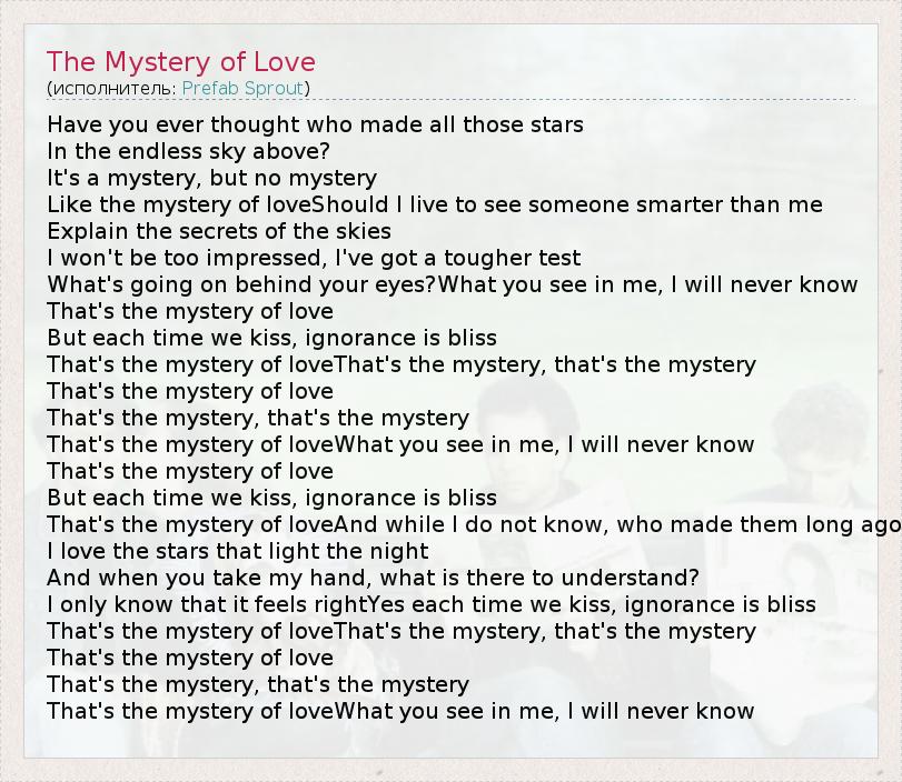 А как ты думаешь, о чем песня "The Mystery of Love" ?