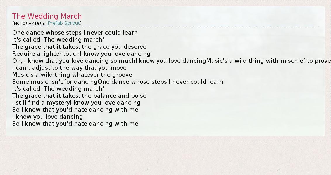 One dance whose steps I never could learn It's called 'The wedding march' The grace that it takes, the grace you deserve Require a lighter touchI know you love dancing Oh, I know that you love dancing so muchI know you love dancingMusic's a wild thing with mischief to prove I can't adjust to the way that you move Music's a wild thing whatever the groove Some music isn't for dancingOne dance whose steps I never could learn It's called 'The wedding march' The grace that it takes, the balance and poise I still find a mysteryI know you love dancing So I know that you'd hate dancing with me I know you love dancing So I know that you'd hate dancing with me