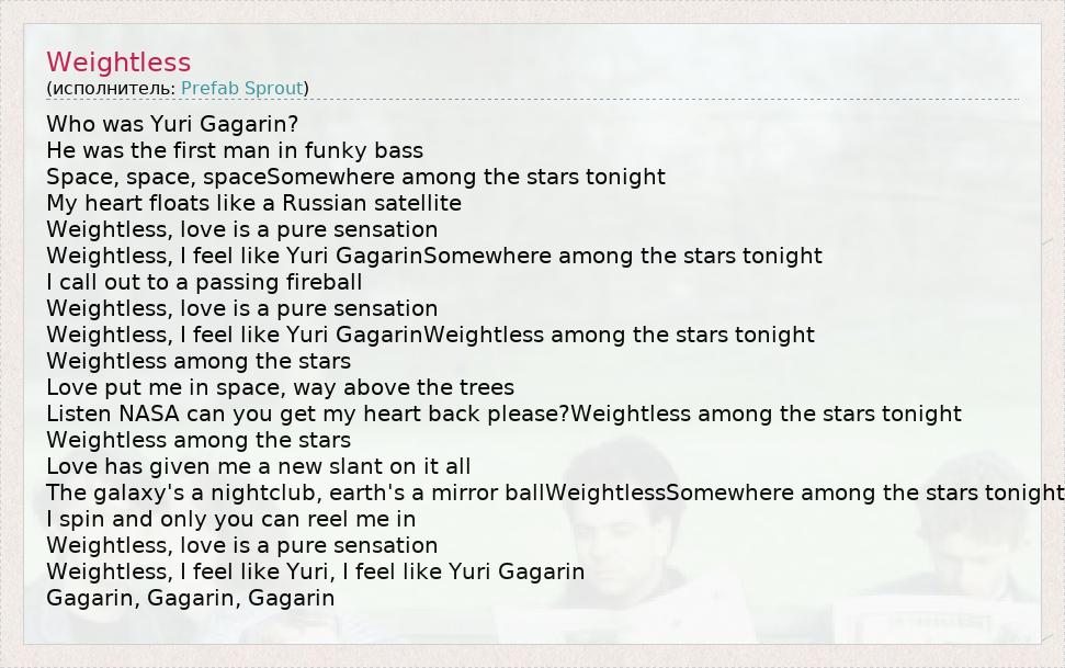Weightless, I feel like Yuri, I feel like Yuri Gagarin