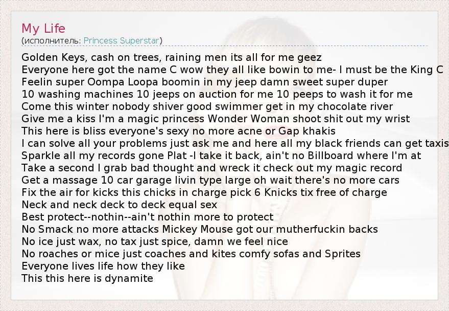 Это интересно:Princess Superstar — действительно одновременно и принцесса и суперзвезда. Владелица собственного лейбла Corrupt Conglomerate, причем отказывается выпускать на нём кого-либо кроме себя. Автор нескольких успешных альбомов. Диджей, МС, певица, просто красавица. Не даром ведь даже Prodigy приглашали её украсить треки на своих альбомах.В общем-то, сама по себе Princess Superstar добилась того, чего... продолжение
