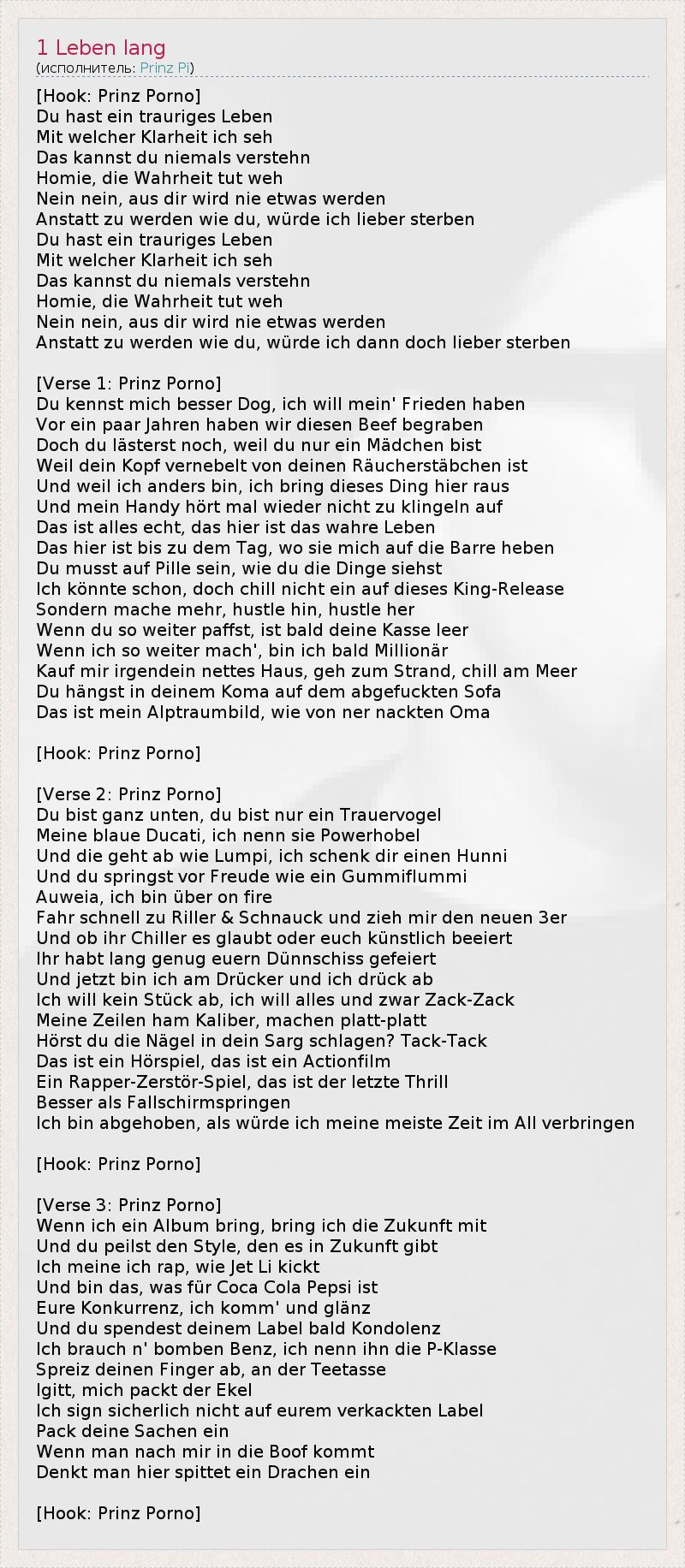 [Hook: Prinz Porno] Du hast ein trauriges Leben Mit welcher Klarheit ich seh Das kannst du niemals verstehn Homie, die Wahrheit tut weh Nein nein, aus dir wird nie etwas werden Anstatt zu werden wie du, würde ich lieber sterben Du hast ein trauriges Leben Mit welcher Klarheit ich seh Das kannst du niemals verstehn Homie, die Wahrheit tut weh Nein nein, aus dir wird nie etwas werden Anstatt zu werden wie du, würde ich dann doch lieber sterben [Verse 1: Prinz Porno] Du kennst mich besser Dog, ich will mein' Frieden haben Vor ein paar Jahren haben wir diesen Beef begraben Doch du lästerst noch, weil du nur ein Mädchen bist Weil dein Kopf vernebelt von deinen Räucherstäbchen ist Und weil ich anders bin, ich bring dieses Ding hier raus Und mein Handy hört mal wieder nicht zu klingeln auf Das ist alles echt, das hier ist das wahre Leben Das hier ist bis zu dem Tag, wo sie mich auf die Barre heben Du musst auf Pille sein, wie du die Dinge siehst Ich könnte schon, doch chill nicht ein auf dieses King-Release Sondern mache mehr, hustle hin, hustle her Wenn du so weiter paffst, ist bald deine Kasse leer Wenn ich so weiter mach', bin ich bald Millionär Kauf mir irgendein nettes Haus, geh zum Strand, chill am Meer Du hängst in deinem Koma auf dem abgefuckten Sofa Das ist mein Alptraumbild, wie von ner nackten Oma [Hook: Prinz Porno] [Verse 2: Prinz Porno] Du bist ganz unten, du bist nur ein Trauervogel Meine blaue Ducati, ich nenn sie Powerhobel Und die geht ab wie Lumpi, ich schenk dir einen Hunni Und du springst vor Freude wie ein Gummiflummi Auweia, ich bin über on fire Fahr schnell zu Riller & Schnauck und zieh mir den neuen 3er Und ob ihr Chiller es glaubt oder euch künstlich beeiert Ihr habt lang genug euern Dünnschiss gefeiert Und jetzt bin ich am Drücker und ich drück ab Ich will kein Stück ab, ich will alles und zwar Zack-Zack Meine Zeilen ham Kaliber, machen platt-platt Hörst du die Nägel in dein Sarg schlagen? Tack-Tack Das ist ein Hörspiel, das ist ein Actionfilm Ein Rapper-Zerstör-Spiel, das ist der letzte Thrill Besser als Fallschirmspringen Ich bin abgehoben, als würde ich meine meiste Zeit im All verbringen [Hook: Prinz Porno] [Verse 3: Prinz Porno] Wenn ich ein Album bring, bring ich die Zukunft mit Und du peilst den Style, den es in Zukunft gibt Ich meine ich rap, wie Jet Li kickt Und bin das, was für Coca Cola Pepsi ist Eure Konkurrenz, ich komm' und glänz Und du spendest deinem Label bald Kondolenz Ich brauch n' bomben Benz, ich nenn ihn die P-Klasse Spreiz deinen Finger ab, an der Teetasse Igitt, mich packt der Ekel Ich sign sicherlich nicht auf eurem verkackten Label Pack deine Sachen ein Wenn man nach mir in die Boof kommt Denkt man hier spittet ein Drachen ein [Hook: Prinz Porno]