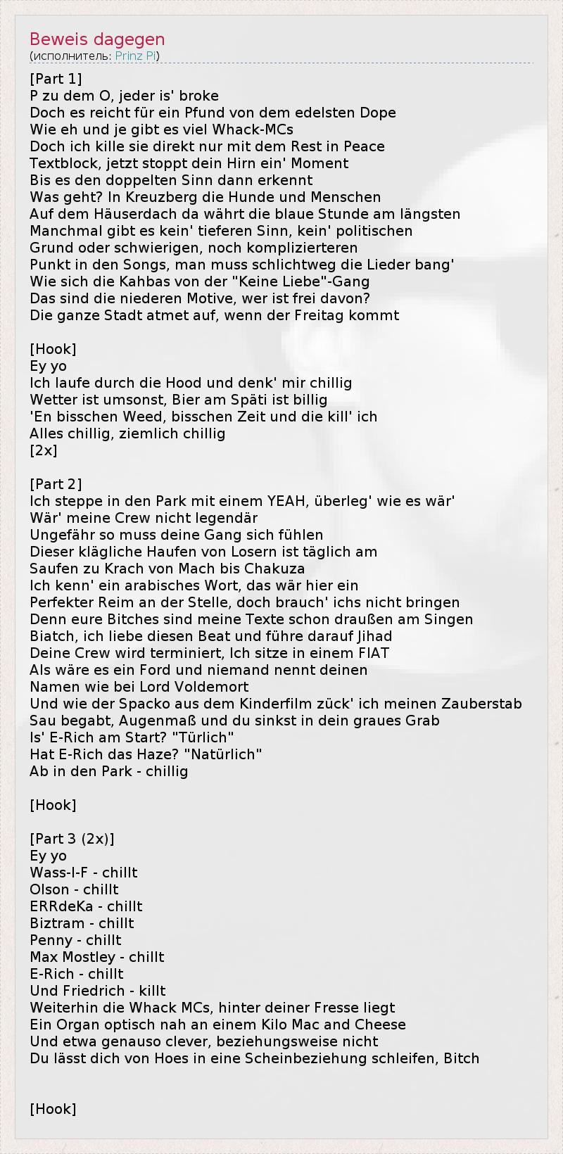 [Part 1] P zu dem O, jeder is' broke Doch es reicht für ein Pfund von dem edelsten Dope Wie eh und je gibt es viel Whack-MCs Doch ich kille sie direkt nur mit dem Rest in Peace Textblock, jetzt stoppt dein Hirn ein' Moment Bis es den doppelten Sinn dann erkennt Was geht? In Kreuzberg die Hunde und Menschen Auf dem Häuserdach da währt die blaue Stunde am längsten Manchmal gibt es kein' tieferen Sinn, kein' politischen Grund oder schwierigen, noch komplizierteren Punkt in den Songs, man muss schlichtweg die Lieder bang' Wie sich die Kahbas von der "Keine Liebe"-Gang Das sind die niederen Motive, wer ist frei davon? Die ganze Stadt atmet auf, wenn der Freitag kommt [Hook] Ey yo Ich laufe durch die Hood und denk' mir chillig Wetter ist umsonst, Bier am Späti ist billig 'En bisschen Weed, bisschen Zeit und die kill' ich Alles chillig, ziemlich chillig [2x] [Part 2] Ich steppe in den Park mit einem YEAH, überleg' wie es wär' Wär' meine Crew nicht legendär Ungefähr so muss deine Gang sich fühlen Dieser klägliche Haufen von Losern ist täglich am Saufen zu Krach von Mach bis Chakuza Ich kenn' ein arabisches Wort, das wär hier ein Perfekter Reim an der Stelle, doch brauch' ichs nicht bringen Denn eure Bitches sind meine Texte schon draußen am Singen Biatch, ich liebe diesen Beat und führe darauf Jihad Deine Crew wird terminiert, Ich sitze in einem FIAT Als wäre es ein Ford und niemand nennt deinen Namen wie bei Lord Voldemort Und wie der Spacko aus dem Kinderfilm zück' ich meinen Zauberstab Sau begabt, Augenmaß und du sinkst in dein graues Grab Is' E-Rich am Start? "Türlich" Hat E-Rich das Haze? "Natürlich" Ab in den Park - chillig [Hook] [Part 3 (2x)] Ey yo Wass-I-F - chillt Olson - chillt ERRdeKa - chillt Biztram - chillt Penny - chillt Max Mostley - chillt E-Rich - chillt Und Friedrich - killt Weiterhin die Whack MCs, hinter deiner Fresse liegt Ein Organ optisch nah an einem Kilo Mac and Cheese Und etwa genauso clever, beziehungsweise nicht Du lässt dich von Hoes in eine Scheinbeziehung schleifen, Bitch [Hook]