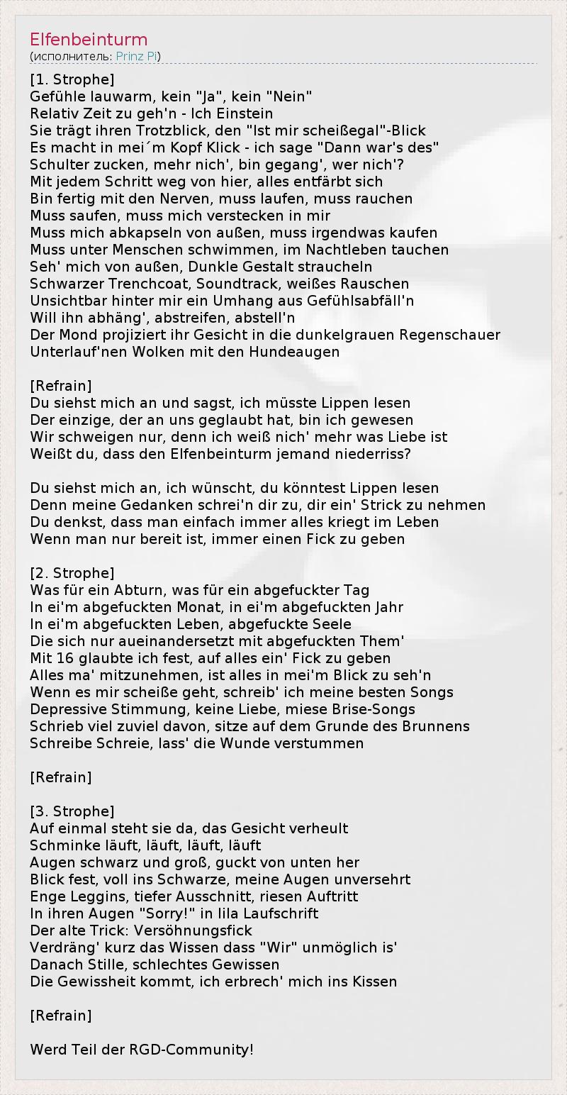 [1. Strophe] Gefühle lauwarm, kein "Ja", kein "Nein" Relativ Zeit zu geh'n - Ich Einstein Sie trägt ihren Trotzblick, den "Ist mir scheißegal"-Blick Es macht in mei´m Kopf Klick - ich sage "Dann war's des" Schulter zucken, mehr nich', bin gegang', wer nich'? Mit jedem Schritt weg von hier, alles entfärbt sich Bin fertig mit den Nerven, muss laufen, muss rauchen Muss saufen, muss mich verstecken in mir Muss mich abkapseln von außen, muss irgendwas kaufen Muss unter Menschen schwimmen, im Nachtleben tauchen Seh' mich von außen, Dunkle Gestalt straucheln Schwarzer Trenchcoat, Soundtrack, weißes Rauschen Unsichtbar hinter mir ein Umhang aus Gefühlsabfäll'n Will ihn abhäng', abstreifen, abstell'n Der Mond projiziert ihr Gesicht in die dunkelgrauen Regenschauer Unterlauf'nen Wolken mit den Hundeaugen [Refrain] Du siehst mich an und sagst, ich müsste Lippen lesen Der einzige, der an uns geglaubt hat, bin ich gewesen Wir schweigen nur, denn ich weiß nich' mehr was Liebe ist Weißt du, dass den Elfenbeinturm jemand niederriss? Du siehst mich an, ich wünscht, du könntest Lippen lesen Denn meine Gedanken schrei'n dir zu, dir ein' Strick zu nehmen Du denkst, dass man einfach immer alles kriegt im Leben Wenn man nur bereit ist, immer einen Fick zu geben [2. Strophe] Was für ein Abturn, was für ein abgefuckter Tag In ei'm abgefuckten Monat, in ei'm abgefuckten Jahr In ei'm abgefuckten Leben, abgefuckte Seele Die sich nur aueinandersetzt mit abgefuckten Them' Mit 16 glaubte ich fest, auf alles ein' Fick zu geben Alles ma' mitzunehmen, ist alles in mei'm Blick zu seh'n Wenn es mir scheiße geht, schreib' ich meine besten Songs Depressive Stimmung, keine Liebe, miese Brise-Songs Schrieb viel zuviel davon, sitze auf dem Grunde des Brunnens Schreibe Schreie, lass' die Wunde verstummen [Refrain] [3. Strophe] Auf einmal steht sie da, das Gesicht verheult Schminke läuft, läuft, läuft, läuft Augen schwarz und groß, guckt von unten her Blick fest, voll ins Schwarze, meine Augen unversehrt Enge Leggins, tiefer Ausschnitt, riesen Auftritt In ihren Augen "Sorry!" in lila Laufschrift Der alte Trick: Versöhnungsfick Verdräng' kurz das Wissen dass "Wir" unmöglich is' Danach Stille, schlechtes Gewissen Die Gewissheit kommt, ich erbrech' mich ins Kissen [Refrain] Werd Teil der RGD-Community!