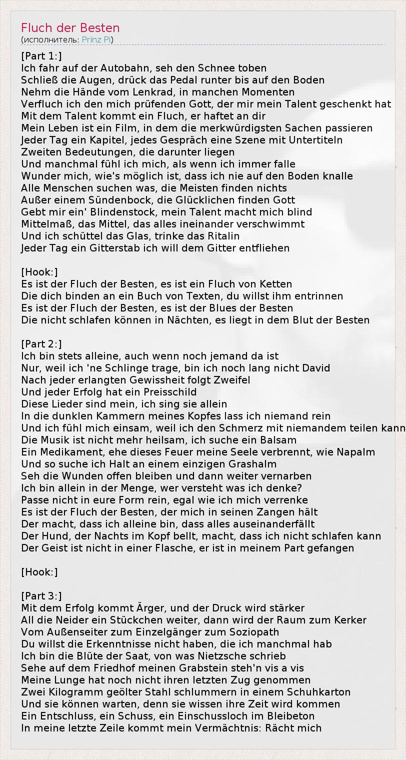 [Part 1:] Ich fahr auf der Autobahn, seh den Schnee toben Schließ die Augen, drück das Pedal runter bis auf den Boden Nehm die Hände vom Lenkrad, in manchen Momenten Verfluch ich den mich prüfenden Gott, der mir mein Talent geschenkt hat Mit dem Talent kommt ein Fluch, er haftet an dir Mein Leben ist ein Film, in dem die merkwürdigsten Sachen passieren Jeder Tag ein Kapitel, jedes Gespräch eine Szene mit Untertiteln Zweiten Bedeutungen, die darunter liegen Und manchmal fühl ich mich, als wenn ich immer falle Wunder mich, wie's möglich ist, dass ich nie auf den Boden knalle Alle Menschen suchen was, die Meisten finden nichts Außer einem Sündenbock, die Glücklichen finden Gott Gebt mir ein' Blindenstock, mein Talent macht mich blind Mittelmaß, das Mittel, das alles ineinander verschwimmt Und ich schüttel das Glas, trinke das Ritalin Jeder Tag ein Gitterstab ich will dem Gitter entfliehen [Hook:] Es ist der Fluch der Besten, es ist ein Fluch von Ketten Die dich binden an ein Buch von Texten, du willst ihm entrinnen Es ist der Fluch der Besten, es ist der Blues der Besten Die nicht schlafen können in Nächten, es liegt in dem Blut der Besten [Part 2:] Ich bin stets alleine, auch wenn noch jemand da ist Nur, weil ich 'ne Schlinge trage, bin ich noch lang nicht David Nach jeder erlangten Gewissheit folgt Zweifel Und jeder Erfolg hat ein Preisschild Diese Lieder sind mein, ich sing sie allein In die dunklen Kammern meines Kopfes lass ich niemand rein Und ich fühl mich einsam, weil ich den Schmerz mit niemandem teilen kann Die Musik ist nicht mehr heilsam, ich suche ein Balsam Ein Medikament, ehe dieses Feuer meine Seele verbrennt, wie Napalm Und so suche ich Halt an einem einzigen Grashalm Seh die Wunden offen bleiben und dann weiter vernarben Ich bin allein in der Menge, wer versteht was ich denke? Passe nicht in eure Form rein, egal wie ich mich verrenke Es ist der Fluch der Besten, der mich in seinen Zangen hält Der macht, dass ich alleine bin, dass alles auseinanderfällt Der Hund, der Nachts im Kopf bellt, macht, dass ich nicht schlafen kann Der Geist ist nicht in einer Flasche, er ist in meinem Part gefangen [Hook:] [Part 3:] Mit dem Erfolg kommt Ärger, und der Druck wird stärker All die Neider ein Stückchen weiter, dann wird der Raum zum Kerker Vom Außenseiter zum Einzelgänger zum Soziopath Du willst die Erkenntnisse nicht haben, die ich manchmal hab Ich bin die Blüte der Saat, von was Nietzsche schrieb Sehe auf dem Friedhof meinen Grabstein steh'n vis a vis Meine Lunge hat noch nicht ihren letzten Zug genommen Zwei Kilogramm geölter Stahl schlummern in einem Schuhkarton Und sie können warten, denn sie wissen ihre Zeit wird kommen Ein Entschluss, ein Schuss, ein Einschussloch im Bleibeton In meine letzte Zeile kommt mein Vermächtnis: Rächt mich