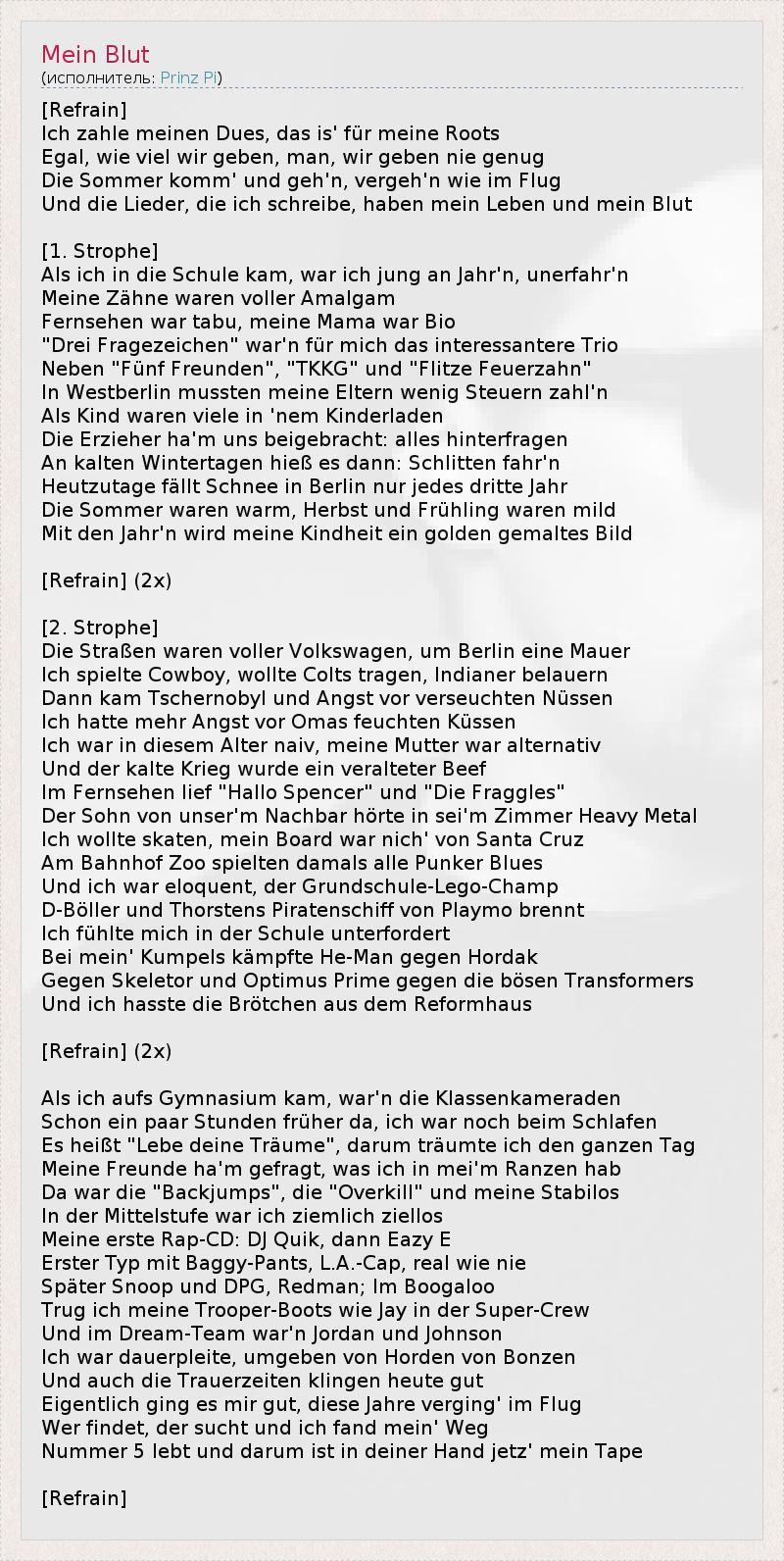 [Refrain] Ich zahle meinen Dues, das is' für meine Roots Egal, wie viel wir geben, man, wir geben nie genug Die Sommer komm' und geh'n, vergeh'n wie im Flug Und die Lieder, die ich schreibe, haben mein Leben und mein Blut [1. Strophe] Als ich in die Schule kam, war ich jung an Jahr'n, unerfahr'n Meine Zähne waren voller Amalgam Fernsehen war tabu, meine Mama war Bio "Drei Fragezeichen" war'n für mich das interessantere Trio Neben "Fünf Freunden", "TKKG" und "Flitze Feuerzahn" In Westberlin mussten meine Eltern wenig Steuern zahl'n Als Kind waren viele in 'nem Kinderladen Die Erzieher ha'm uns beigebracht: alles hinterfragen An kalten Wintertagen hieß es dann: Schlitten fahr'n Heutzutage fällt Schnee in Berlin nur jedes dritte Jahr Die Sommer waren warm, Herbst und Frühling waren mild Mit den Jahr'n wird meine Kindheit ein golden gemaltes Bild [Refrain] (2x) [2. Strophe] Die Straßen waren voller Volkswagen, um Berlin eine Mauer Ich spielte Cowboy, wollte Colts tragen, Indianer belauern Dann kam Tschernobyl und Angst vor verseuchten Nüssen Ich hatte mehr Angst vor Omas feuchten Küssen Ich war in diesem Alter naiv, meine Mutter war alternativ Und der kalte Krieg wurde ein veralteter Beef Im Fernsehen lief "Hallo Spencer" und "Die Fraggles" Der Sohn von unser'm Nachbar hörte in sei'm Zimmer Heavy Metal Ich wollte skaten, mein Board war nich' von Santa Cruz Am Bahnhof Zoo spielten damals alle Punker Blues Und ich war eloquent, der Grundschule-Lego-Champ D-Böller und Thorstens Piratenschiff von Playmo brennt Ich fühlte mich in der Schule unterfordert Bei mein' Kumpels kämpfte He-Man gegen Hordak Gegen Skeletor und Optimus Prime gegen die bösen Transformers Und ich hasste die Brötchen aus dem Reformhaus [Refrain] (2x) Als ich aufs Gymnasium kam, war'n die Klassenkameraden Schon ein paar Stunden früher da, ich war noch beim Schlafen Es heißt "Lebe deine Träume", darum träumte ich den ganzen Tag Meine Freunde ha'm gefragt, was ich in mei'm Ranzen hab Da war die "Backjumps", die "Overkill" und meine Stabilos In der Mittelstufe war ich ziemlich ziellos Meine erste Rap-CD: DJ Quik, dann Eazy E Erster Typ mit Baggy-Pants, L.A.-Cap, real wie nie Später Snoop und DPG, Redman; Im Boogaloo Trug ich meine Trooper-Boots wie Jay in der Super-Crew Und im Dream-Team war'n Jordan und Johnson Ich war dauerpleite, umgeben von Horden von Bonzen Und auch die Trauerzeiten klingen heute gut Eigentlich ging es mir gut, diese Jahre verging' im Flug Wer findet, der sucht und ich fand mein' Weg Nummer 5 lebt und darum ist in deiner Hand jetz' mein Tape [Refrain]