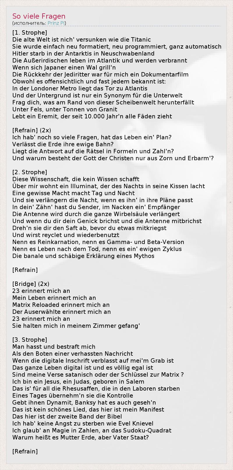 [1. Strophe] Die alte Welt ist nich' versunken wie die Titanic Sie wurde einfach neu formatiert, neu programmiert, ganz automatisch Hitler starb in der Antarktis in Neuschwabenland Die Außerirdischen leben im Atlantik und werden verbrannt Wenn sich Japaner einen Wal grill'n Die Rückkehr der Jediritter war für mich ein Dokumentarfilm Obwohl es offensichtlich und fast jedem bekannt ist: In der Londoner Metro liegt das Tor zu Atlantis Und der Untergrund ist nur ein Synonym für die Unterwelt Frag dich, was am Rand von dieser Scheibenwelt herunterfällt Unter Fels, unter Tonnen von Granit Lebt ein Eremit, der seit 10.000 Jahr'n alle Fäden zieht [Refrain] (2x) Ich hab' noch so viele Fragen, hat das Leben ein' Plan? Verlässt die Erde ihre ewige Bahn? Liegt die Antwort auf die Rätsel in Formeln und Zahl'n? Und warum besteht der Gott der Christen nur aus Zorn und Erbarm'? [2. Strophe] Diese Wissenschaft, die kein Wissen schafft Über mir wohnt ein Illuminat, der des Nachts in seine Kissen lacht Eine gewisse Macht macht Tag und Nacht Und sie verlängern die Nacht, wenn es ihn' in ihre Pläne passt In dein' Zähn' hast du Sender, im Nacken ein' Empfänger Die Antenne wird durch die ganze Wirbelsäule verlängert Und wenn du dir dein Genick brichst und die Antenne mitbrichst Dreh'n sie dir den Saft ab, bevor du etwas mitkriegst Und wirst reyclet und wiederbenutzt Nenn es Reinkarnation, nenn es Gamma- und Beta-Version Nenn es Leben nach dem Tod, nenn es ein' ewigen Zyklus Die banale und schäbige Erklärung eines Mythos [Refrain] [Bridge] (2x) 23 erinnert mich an Mein Leben erinnert mich an Matrix Reloaded erinnert mich an Der Auserwählte erinnert mich an 23 erinnert mich an Sie halten mich in meinem Zimmer gefang' [3. Strophe] Man hasst und bestraft mich Als den Boten einer verhassten Nachricht Wenn die digitale Inschrift verblasst auf mei'm Grab ist Das ganze Leben digital ist und es völlig egal ist Sind meine Verse satanisch oder der Schlüssel zur Matrix ? Ich bin ein Jesus, ein Judas, geboren in Salem Das is' für all die Rhesusaffen, die in den Laboren starben Eines Tages übernehm'n sie die Kontrolle Gebt ihnen Dynamit, Banksy hat es auch geseh'n Das ist kein schönes Lied, das hier ist mein Manifest Das hier ist der zweite Band der Bibel Ich hab' keine Angst zu sterben wie Evel Knievel Ich glaub' an Magie in Zahlen, an das Sudoku-Quadrat Warum heißt es Mutter Erde, aber Vater Staat? [Refrain]