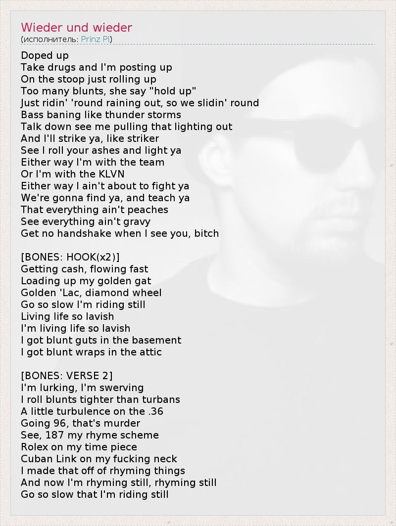 легированных до Возьмите наркотики и я отправляю до На крыльце только свертывающей Слишком много притупляет , она сказала " задержать " Просто Ridin ' ' Round дождь , таким образом мы , раздвижные 'вокруг Бас Банинг как гром бури Поговорите вниз видеть меня тянет , что освещение из И я буду бить я, как нападающий Видите, я свернуть свой прах и свет Я. В любом случае я с командой Или я с KLVN В любом случае я не собирается бороться Я. Мы найдем тебе, и учить Я. Это все не персики Смотреть все не соус Не получают рукопожатие , когда я вижу тебя, сука [ КОСТИ : крючок (x2) ] Получение наличных , течет быстро Загрузка мой золотой револьвер Золотой " Лак, алмазный круг Перейти так медленно я еду еще Живая жизнь так щедро Я живу жизнь так щедро Я получил тупые кишки в подвале Я получил тупые обертывания на чердаке [ КОСТИ : Куплет 2] Я скрывается , я сворачивает Я качусь притупляет более жесткими, чем тюрбанах Немного турбулентность на 0,36 Переход 96 , что это убийство Смотрите , 187 моя схема рифмы Rolex на моем временном отрезке Кубинский Ссылка на моем чертовом шеи Я сделал , что прочь рифмы вещи И теперь я рифмы еще , рифмы еще Перейти настолько медленно, что я еду по-прежнему