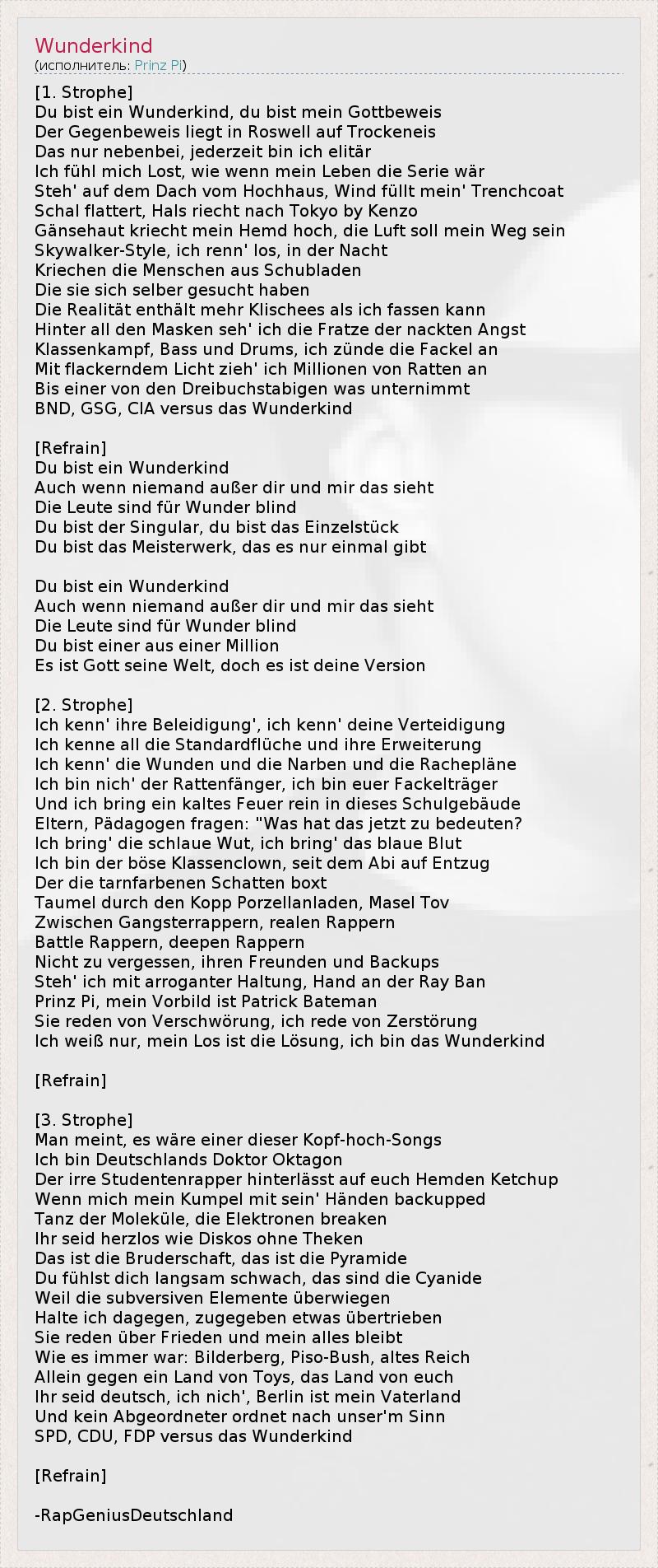 [1. Strophe] Du bist ein Wunderkind, du bist mein Gottbeweis Der Gegenbeweis liegt in Roswell auf Trockeneis Das nur nebenbei, jederzeit bin ich elitär Ich fühl mich Lost, wie wenn mein Leben die Serie wär Steh' auf dem Dach vom Hochhaus, Wind füllt mein' Trenchcoat Schal flattert, Hals riecht nach Tokyo by Kenzo Gänsehaut kriecht mein Hemd hoch, die Luft soll mein Weg sein Skywalker-Style, ich renn' los, in der Nacht Kriechen die Menschen aus Schubladen Die sie sich selber gesucht haben Die Realität enthält mehr Klischees als ich fassen kann Hinter all den Masken seh' ich die Fratze der nackten Angst Klassenkampf, Bass und Drums, ich zünde die Fackel an Mit flackerndem Licht zieh' ich Millionen von Ratten an Bis einer von den Dreibuchstabigen was unternimmt BND, GSG, CIA versus das Wunderkind [Refrain] Du bist ein Wunderkind Auch wenn niemand außer dir und mir das sieht Die Leute sind für Wunder blind Du bist der Singular, du bist das Einzelstück Du bist das Meisterwerk, das es nur einmal gibt Du bist ein Wunderkind Auch wenn niemand außer dir und mir das sieht Die Leute sind für Wunder blind Du bist einer aus einer Million Es ist Gott seine Welt, doch es ist deine Version [2. Strophe] Ich kenn' ihre Beleidigung', ich kenn' deine Verteidigung Ich kenne all die Standardflüche und ihre Erweiterung Ich kenn' die Wunden und die Narben und die Rachepläne Ich bin nich' der Rattenfänger, ich bin euer Fackelträger Und ich bring ein kaltes Feuer rein in dieses Schulgebäude Eltern, Pädagogen fragen: "Was hat das jetzt zu bedeuten? Ich bring' die schlaue Wut, ich bring' das blaue Blut Ich bin der böse Klassenclown, seit dem Abi auf Entzug Der die tarnfarbenen Schatten boxt Taumel durch den Kopp Porzellanladen, Masel Tov Zwischen Gangsterrappern, realen Rappern Battle Rappern, deepen Rappern Nicht zu vergessen, ihren Freunden und Backups Steh' ich mit arroganter Haltung, Hand an der Ray Ban Prinz Pi, mein Vorbild ist Patrick Bateman Sie reden von Verschwörung, ich rede von Zerstörung Ich weiß nur, mein Los ist die Lösung, ich bin das Wunderkind [Refrain] [3. Strophe] Man meint, es wäre einer dieser Kopf-hoch-Songs Ich bin Deutschlands Doktor Oktagon Der irre Studentenrapper hinterlässt auf euch Hemden Ketchup Wenn mich mein Kumpel mit sein' Händen backupped Tanz der Moleküle, die Elektronen breaken Ihr seid herzlos wie Diskos ohne Theken Das ist die Bruderschaft, das ist die Pyramide Du fühlst dich langsam schwach, das sind die Cyanide Weil die subversiven Elemente überwiegen Halte ich dagegen, zugegeben etwas übertrieben Sie reden über Frieden und mein alles bleibt Wie es immer war: Bilderberg, Piso-Bush, altes Reich Allein gegen ein Land von Toys, das Land von euch Ihr seid deutsch, ich nich', Berlin ist mein Vaterland Und kein Abgeordneter ordnet nach unser'm Sinn SPD, CDU, FDP versus das Wunderkind [Refrain] -RapGeniusDeutschland