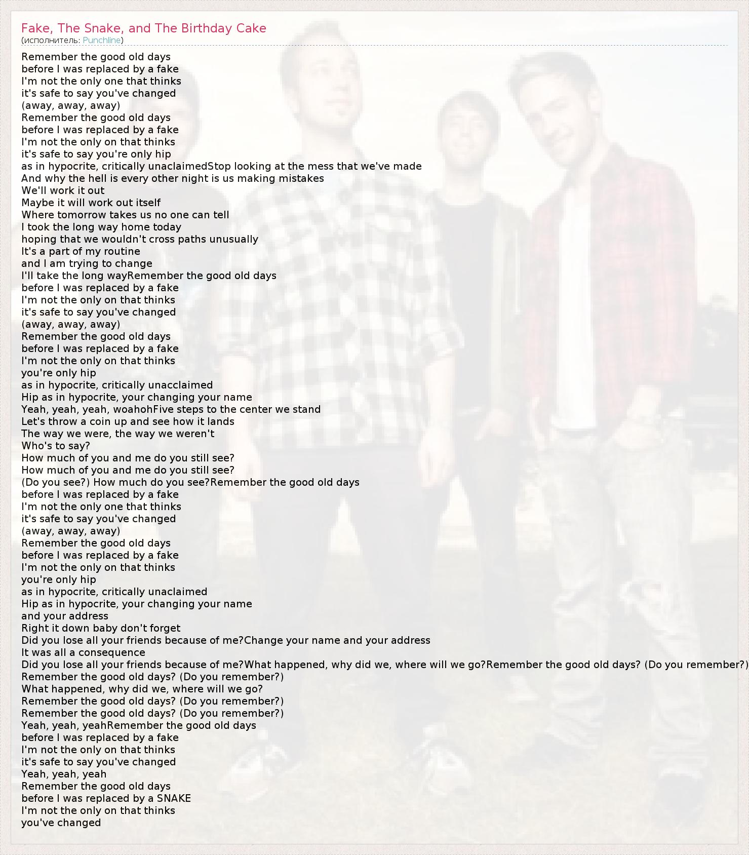 Remember the good old days before I was replaced by a fake I'm not the only one that thinks it's safe to say you've changed (away, away, away) Remember the good old days before I was replaced by a fake I'm not the only on that thinks it's safe to say you're only hip as in hypocrite, critically unaclaimedStop looking at the mess that we've made And why the hell is every other night is us making mistakes We'll work it out Maybe it will work out itself Where tomorrow takes us no one can tell I took the long way home today hoping that we wouldn't cross paths unusually It's a part of my routine and I am trying to change I'll take the long wayRemember the good old days before I was replaced by a fake I'm not the only on that thinks it's safe to say you've changed (away, away, away) Remember the good old days before I was replaced by a fake I'm not the only on that thinks you're only hip as in hypocrite, critically unacclaimed Hip as in hypocrite, your changing your name Yeah, yeah, yeah, woahohFive steps to the center we stand Let's throw a coin up and see how it lands The way we were, the way we weren't Who's to say? How much of you and me do you still see? How much of you and me do you still see? (Do you see?) How much do you see?Remember the good old days before I was replaced by a fake I'm not the only one that thinks it's safe to say you've changed (away, away, away) Remember the good old days before I was replaced by a fake I'm not the only on that thinks you're only hip as in hypocrite, critically unaclaimed Hip as in hypocrite, your changing your name and your address Right it down baby don't forget Did you lose all your friends because of me?Change your name and your address It was all a consequence Did you lose all your friends because of me?What happened, why did we, where will we go?Remember the good old days? (Do you remember?) Remember the good old days? (Do you remember?) What happened, why did we, where will we go? Remember the good old days? (Do you remember?) Remember the good old days? (Do you remember?) Yeah, yeah, yeahRemember the good old days before I was replaced by a fake I'm not the only on that thinks it's safe to say you've changed Yeah, yeah, yeah Remember the good old days before I was replaced by a SNAKE I'm not the only on that thinks you've changed