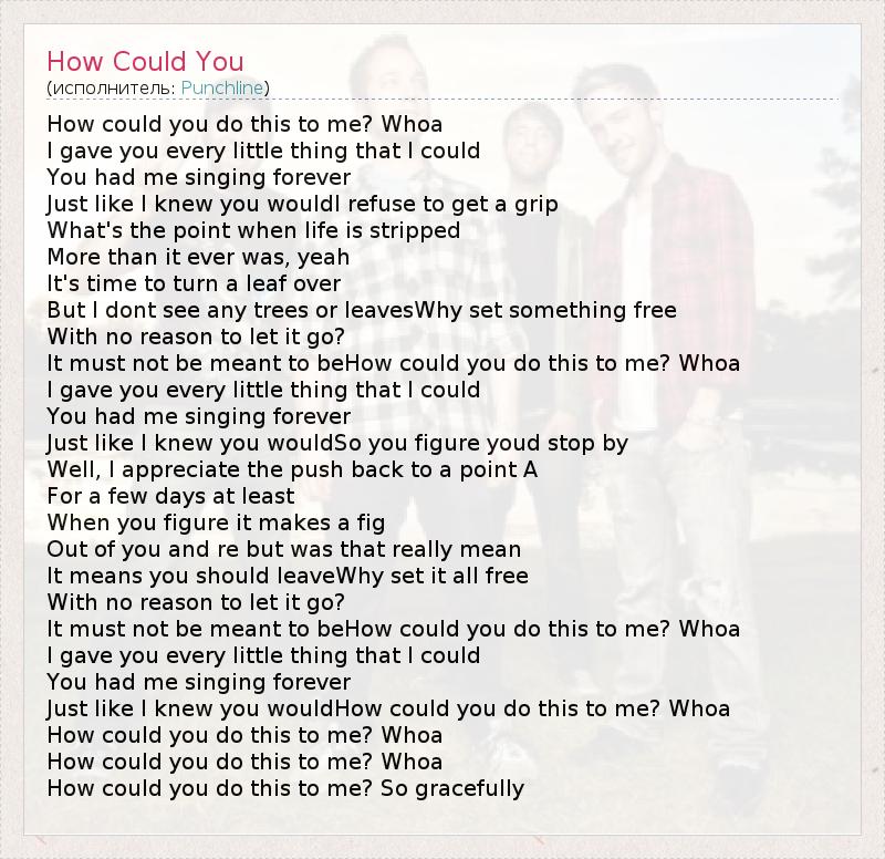 How could you do this to me? Whoa I gave you every little thing that I could You had me singing forever Just like I knew you wouldI refuse to get a grip What's the point when life is stripped More than it ever was, yeah It's time to turn a leaf over But I dont see any trees or leavesWhy set something free With no reason to let it go? It must not be meant to beHow could you do this to me? Whoa I gave you every little thing that I could You had me singing forever Just like I knew you wouldSo you figure youd stop by Well, I appreciate the push back to a point A For a few days at least When you figure it makes a fig Out of you and re but was that really mean It means you should leaveWhy set it all free With no reason to let it go? It must not be meant to beHow could you do this to me? Whoa I gave you every little thing that I could You had me singing forever Just like I knew you wouldHow could you do this to me? Whoa How could you do this to me? Whoa How could you do this to me? Whoa How could you do this to me? So gracefully