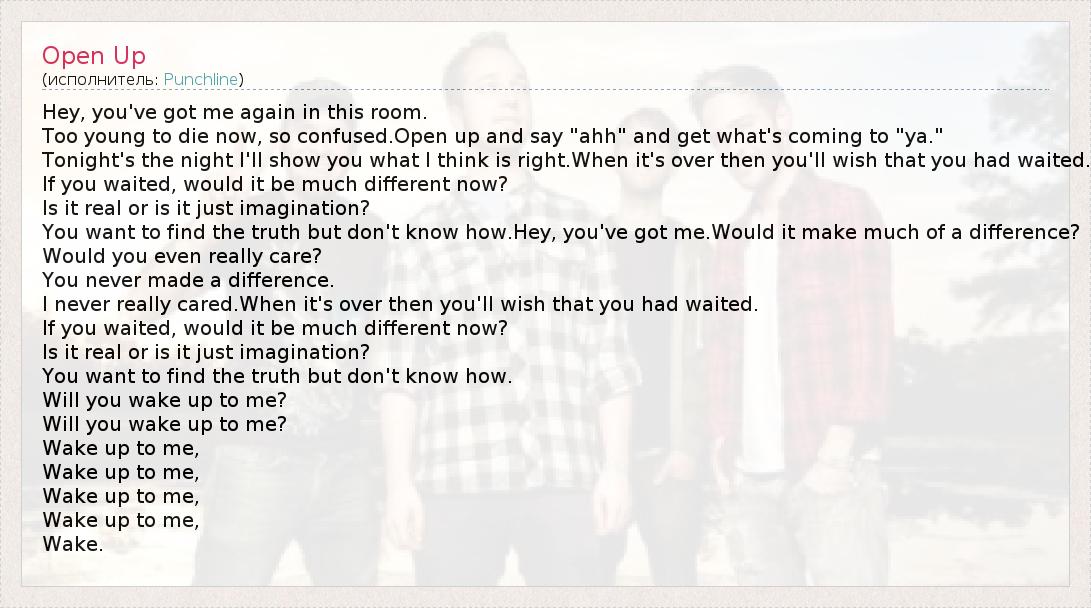Hey, you've got me again in this room. Too young to die now, so confused.Open up and say "ahh" and get what's coming to "ya." Tonight's the night I'll show you what I think is right.When it's over then you'll wish that you had waited. If you waited, would it be much different now? Is it real or is it just imagination? You want to find the truth but don't know how.Hey, you've got me.Would it make much of a difference? Would you even really care? You never made a difference. I never really cared.When it's over then you'll wish that you had waited. If you waited, would it be much different now? Is it real or is it just imagination? You want to find the truth but don't know how. Will you wake up to me? Will you wake up to me? Wake up to me, Wake up to me, Wake up to me, Wake up to me, Wake.
