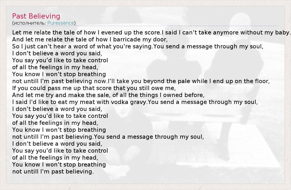 not untill I'm past believing now.I'll take you beyond the pale while I end up on the floor,