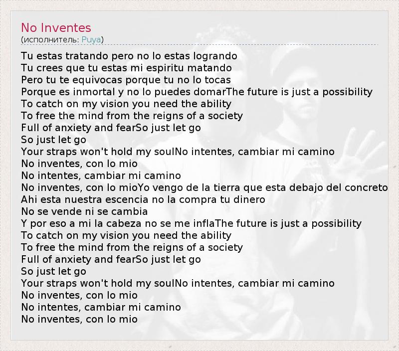 Tu estas tratando pero no lo estas logrando Tu crees que tu estas mi espiritu matando Pero tu te equivocas porque tu no lo tocas Porque es inmortal y no lo puedes domarThe future is just a possibility To catch on my vision you need the ability To free the mind from the reigns of a society Full of anxiety and fearSo just let go So just let go Your straps won't hold my soulNo intentes, cambiar mi camino No inventes, con lo mio No intentes, cambiar mi camino No inventes, con lo mioYo vengo de la tierra que esta debajo del concreto Ahi esta nuestra escencia no la compra tu dinero No se vende ni se cambia Y por eso a mi la cabeza no se me inflaThe future is just a possibility To catch on my vision you need the ability To free the mind from the reigns of a society Full of anxiety and fearSo just let go So just let go Your straps won't hold my soulNo intentes, cambiar mi camino No inventes, con lo mio No intentes, cambiar mi camino No inventes, con lo mio