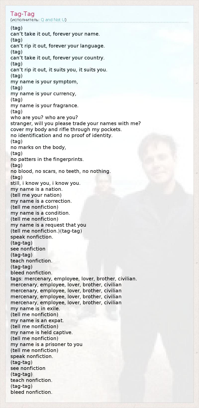 (tag) can't take it out, forever your name. (tag) can't rip it out, forever your language. (tag) can't take it out, forever your country. (tag) can't rip it out, it suits you, it suits you. (tag) my name is your symptom, (tag) my name is your currency, (tag) my name is your fragrance. (tag) who are you? who are you? stranger, will you please trade your names with me? cover my body and rifle through my pockets. no identification and no proof of identity. (tag) no marks on the body, (tag) no patters in the fingerprints. (tag) no blood, no scars, no teeth, no nothing. (tag) still, i know you, i know you. my name is a nation. (tell me your nation) my name is a correction. (tell me nonfiction) my name is a condition. (tell me nonfiction) my name is a request that you (tell me nonfiction.)(tag-tag) speak nonfiction. (tag-tag) see nonfiction (tag-tag) teach nonfiction. (tag-tag) bleed nonfiction. tags: mercenary, employee, lover, brother, civilian. mercenary, employee, lover, brother, civilian mercenary, employee, lover, brother, civilian mercenary, employee, lover, brother, civilian mercenary, employee, lover, brother, civilian my name is in exile. (tell me nonfiction) my name is an expat. (tell me nonfiction) my name is held captive. (tell me nonfiction) my name is a prisoner to you (tell me nonfiction) speak nonfiction. (tag-tag) see nonfiction (tag-tag) teach nonfiction. (tag-tag) bleed nonfiction.