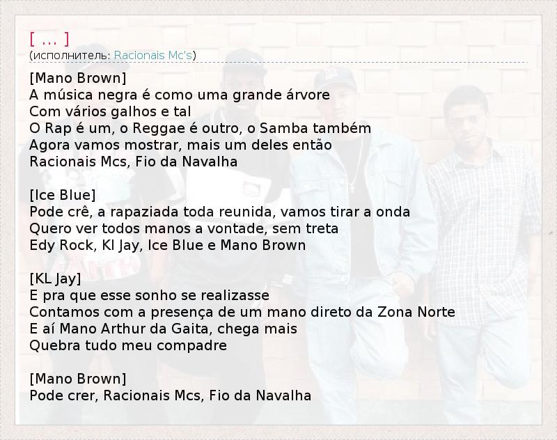 Это интересно:Участники группы Mano Brown, Edi Rock, Ice Blue & DJ KL Jay - выходцы из фавел, располагающихся на окраинах Сан-Паулу, начали выступать в 1980-х годах.В 1988 году была сделана первая запись, вошедшая в сборник "Consciência Black".В 1990 году вышел их первый альбом "Holocausto Urbano".Альбом "Sobrevivendo no Inferno", выпущенный в 1997 году, принес группе достаточно широкую известность (тираж более 500 000 дисков).Тем... продолжение
