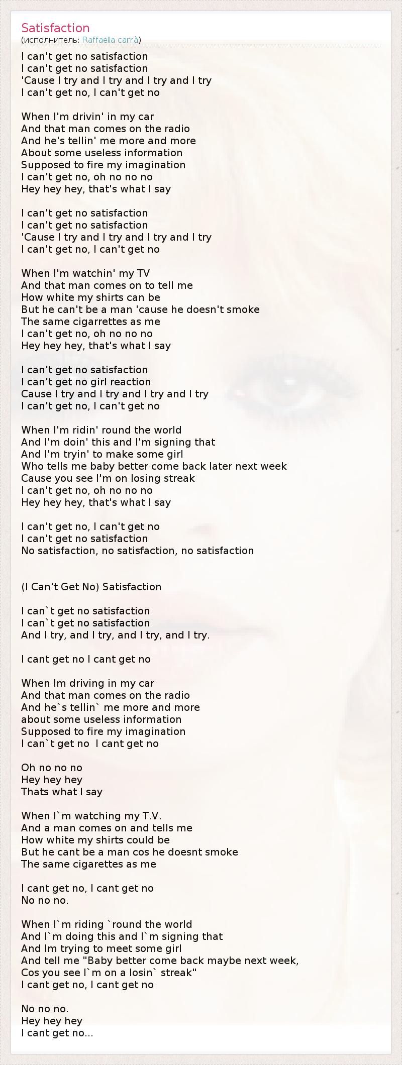I can't get no satisfaction I can't get no satisfaction 'Cause I try and I try and I try and I try I can't get no, I can't get no When I'm drivin' in my car And that man comes on the radio And he's tellin' me more and more About some useless information Supposed to fire my imagination I can't get no, oh no no no Hey hey hey, that's what I say I can't get no satisfaction I can't get no satisfaction 'Cause I try and I try and I try and I try I can't get no, I can't get no When I'm watchin' my TV And that man comes on to tell me How white my shirts can be But he can't be a man 'cause he doesn't smoke The same cigarrettes as me I can't get no, oh no no no Hey hey hey, that's what I say I can't get no satisfaction I can't get no girl reaction Cause I try and I try and I try and I try I can't get no, I can't get no When I'm ridin' round the world And I'm doin' this and I'm signing that And I'm tryin' to make some girl Who tells me baby better come back later next week Cause you see I'm on losing streak I can't get no, oh no no no Hey hey hey, that's what I say I can't get no, I can't get no I can't get no satisfaction No satisfaction, no satisfaction, no satisfaction (I Can't Get No) Satisfaction I can`t get no satisfaction I can`t get no satisfaction And I try, and I try, and I try, and I try. I cant get no I cant get no When Im driving in my car And that man comes on the radio And he`s tellin` me more and more about some useless information Supposed to fire my imagination I can`t get no I cant get no Oh no no no Hey hey hey Thats what I say When I`m watching my T.V. And a man comes on and tells me How white my shirts could be But he cant be a man cos he doesnt smoke The same cigarettes as me I cant get no, I cant get no No no no. When I`m riding `round the world And I`m doing this and I`m signing that And Im trying to meet some girl And tell me "Baby better come back maybe next week, Cos you see I`m on a losin` streak" I cant get no, I cant get no No no no. Hey hey hey I cant get no...
