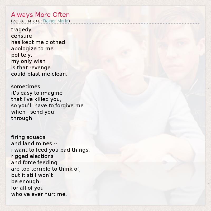 tragedy. censure has kept me clothed. apologize to me politely. my only wish is that revenge could blast me clean. sometimes it's easy to imagine that i've killed you, so you'll have to forgive me when i send you through. firing squads and land mines -- i want to feed you bad things. rigged elections and force feeding are too terrible to think of, but it still won't be enough. for all of you who've ever hurt me.