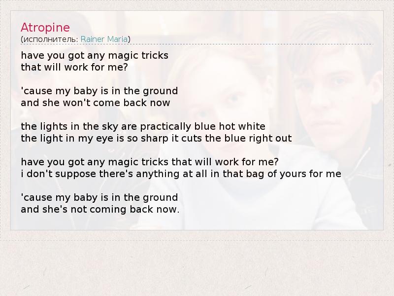 have you got any magic tricks that will work for me? 'cause my baby is in the ground and she won't come back now the lights in the sky are practically blue hot white the light in my eye is so sharp it cuts the blue right out have you got any magic tricks that will work for me? i don't suppose there's anything at all in that bag of yours for me 'cause my baby is in the ground and she's not coming back now.