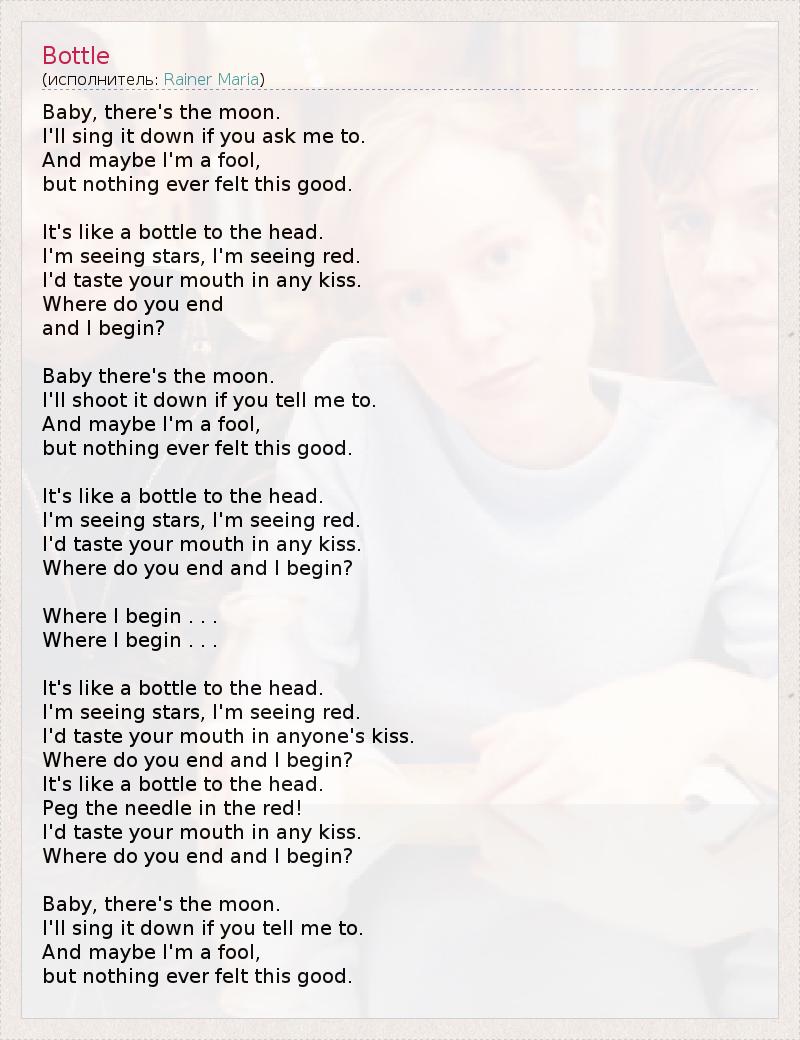 Baby, there's the moon. I'll sing it down if you ask me to. And maybe I'm a fool, but nothing ever felt this good. It's like a bottle to the head. I'm seeing stars, I'm seeing red. I'd taste your mouth in any kiss. Where do you end and I begin? Baby there's the moon. I'll shoot it down if you tell me to. And maybe I'm a fool, but nothing ever felt this good. It's like a bottle to the head. I'm seeing stars, I'm seeing red. I'd taste your mouth in any kiss. Where do you end and I begin? Where I begin . . . Where I begin . . . It's like a bottle to the head. I'm seeing stars, I'm seeing red. I'd taste your mouth in anyone's kiss. Where do you end and I begin? It's like a bottle to the head. Peg the needle in the red! I'd taste your mouth in any kiss. Where do you end and I begin? Baby, there's the moon. I'll sing it down if you tell me to. And maybe I'm a fool, but nothing ever felt this good.